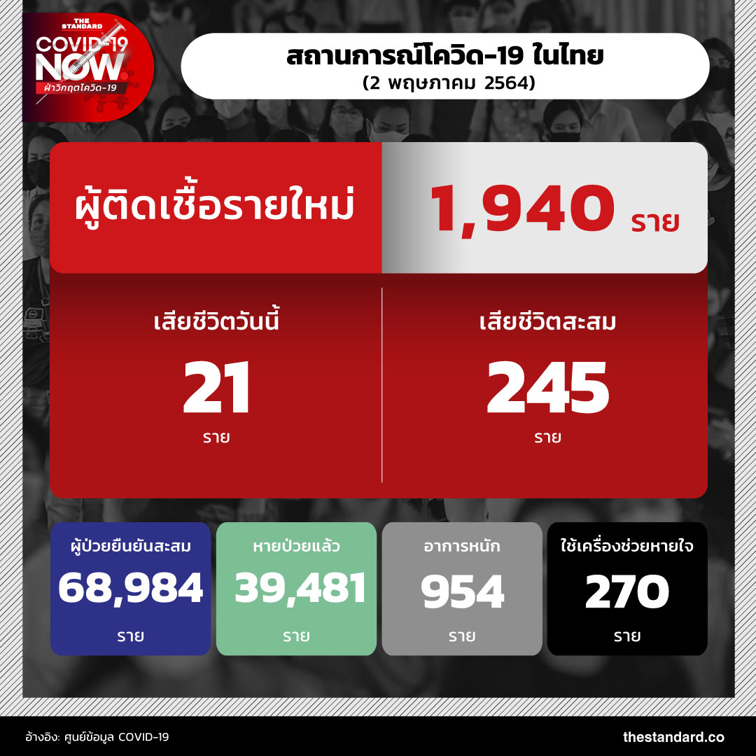 ยอดติดเชื้อพุ่ง 1,940 ราย เสียชีวิตเพิ่ม 21 ราย รักษาตัว 29,481 ราย กระจายในโรงพยาบาล-โรงพยาบาลสนาม