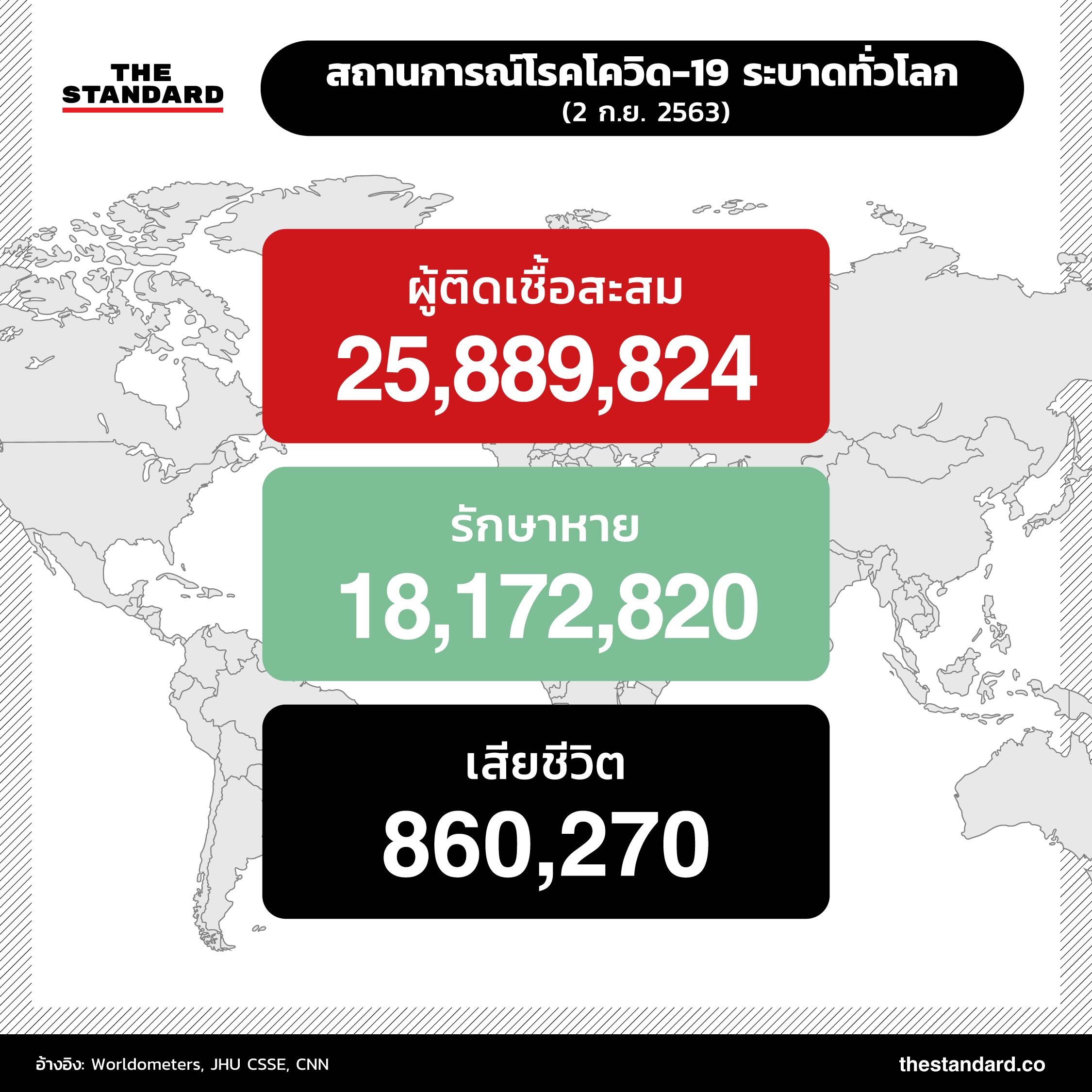 การแพร่ระบาดของโควิด-19 ผ่านมานานถึง 8 เดือนแล้ว ทั่วโลกมีผู้ติดเชื้อสะสมเกิน 25.8 ล้านรายแล้ว (25,889,824 ราย) รักษาหายกว่า 18 ล้านราย (18,172,820 ราย) หรือคิดเป็นเกือบ 2 ใน 3 ของผู้ติดเชื้อทั้งหมด เสียชีวิตแล้ว 860,270 อัตราการเสียชีวิตอยู่ที่ราว 3.3% โดยพบผู้ติดเชื้อเพิ่มเกินวันละ 1 แสนราย ติดต่อกันนานถึง 98 วัน ตั้งแต่วันที่ 27 พฤษภาคมที่ผ่านมา