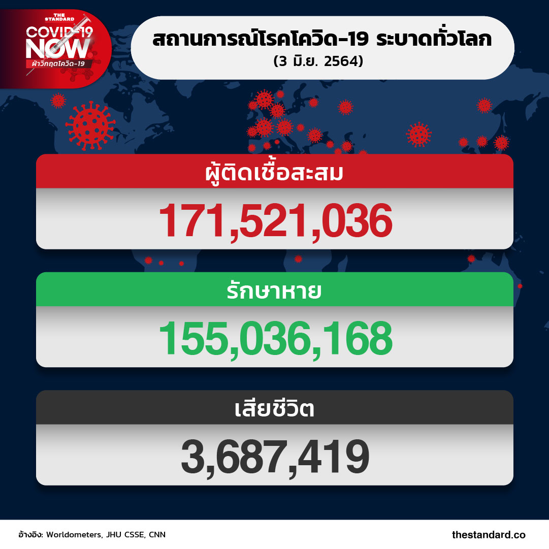 วันนี้ (3 มิถุนายน) ยอดผู้ติดโควิด-19 สะสมพุ่งสูงกว่า 171 ล้านรายทั่วโลก หลังการแพร่ระบาดผ่านมานาน 1 ปี 5 เดือน ยอดผู้เสียชีวิตสูงกว่า 3.6 ล้านราย อัตราเสียชีวิตอยู่ที่ราว 2.1% รักษาหายแล้วราว 90% ของผู้ติดเชื้อทั้งหมด ขณะนี้มีประเทศที่พบผู้ติดเชื้อแล้ว 186 จาก 193 ประเทศทั่วโลก