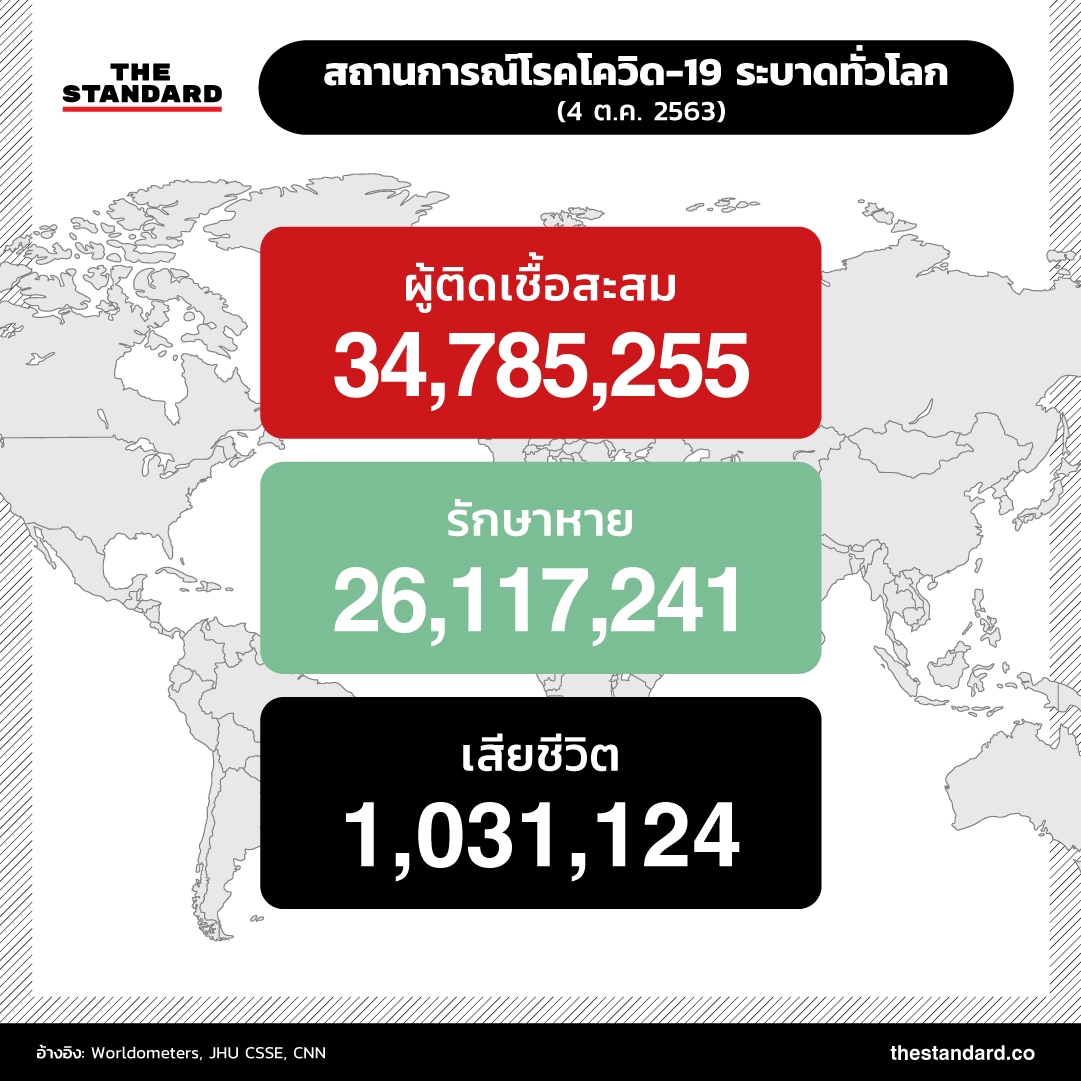 ล่าสุด ทั่วโลกมีผู้ติดเชื้อสะสม 34.7 ล้านรายแล้ว (34,785,255 ราย) รักษาหายกว่า 26 ล้านราย (26,117,241 ราย) หรือคิดเป็นกว่า 2 ใน 3 ของผู้ติดเชื้อทั้งหมด เสียชีวิตแล้ว 1,031,124 ราย อัตราการเสียชีวิตอยู่ที่ราว 3%