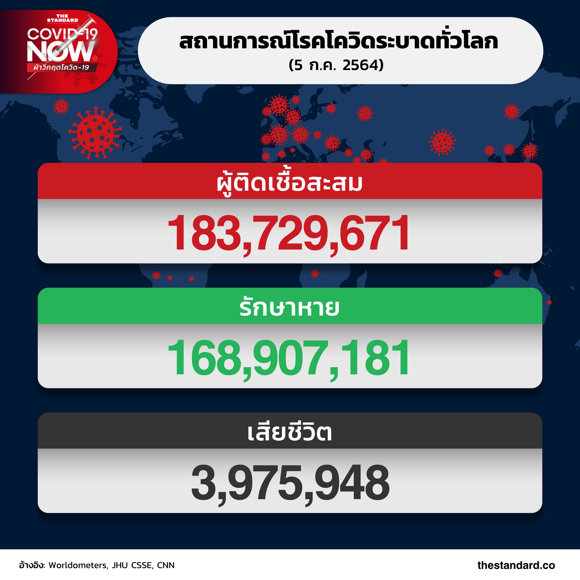วันนี้ (5 กรกฎาคม) ยอดผู้ติดโควิดสะสมพุ่งสูงกว่า 183 ล้านรายทั่วโลก หลังการแพร่ระบาดผ่านมานานเกือบ 1 ปี 6 เดือน ยอดผู้เสียชีวิตสูงกว่า 3.9 ล้านราย อัตราเสียชีวิตอยู่ที่ราว 2.1% รักษาหายแล้วราว 90% ของผู้ติดเชื้อทั้งหมด ขณะนี้มีประเทศที่พบผู้ติดเชื้อแล้ว 187 จาก 193 ประเทศทั่วโลก