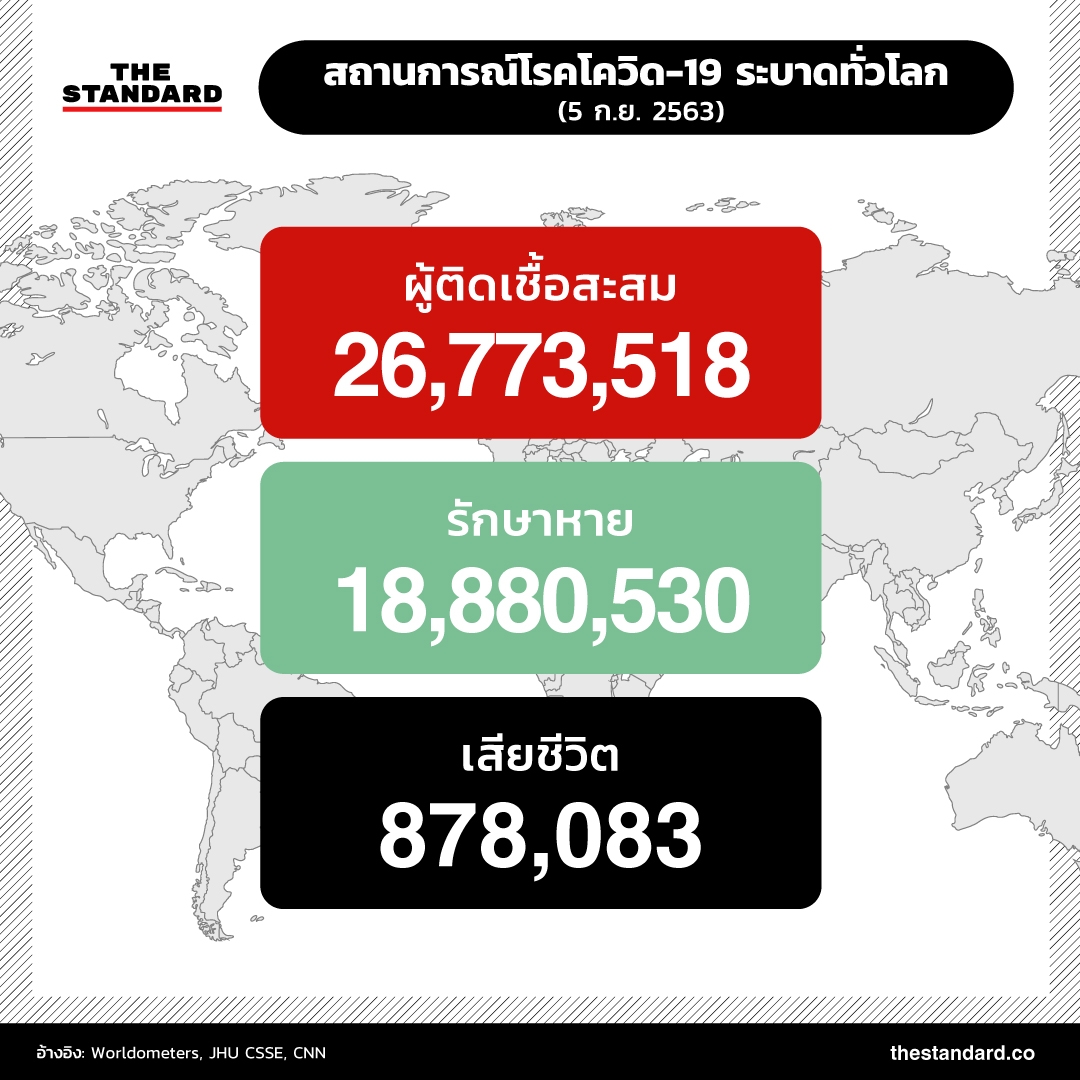 การแพร่ระบาดของโควิด-19 ผ่านมานานกว่า 8 เดือนแล้ว ทั่วโลกมีผู้ติดเชื้อสะสมเกิน 26.7 ล้านราย (26,773,518 ราย) รักษาหายกว่า 18.8 ล้านราย (18,880,530 ราย) หรือคิดเป็นเกือบ 2 ใน 3 ของผู้ติดเชื้อทั้งหมด เสียชีวิตแล้ว 878,083 อัตราการเสียชีวิตอยู่ที่ราว 3.3% โดยพบผู้ติดเชื้อเพิ่มเกินวันละ 1 แสนราย ติดต่อกันนานถึง 101 วัน ตั้งแต่วันที่ 27 พฤษภาคมที่ผ่านมา