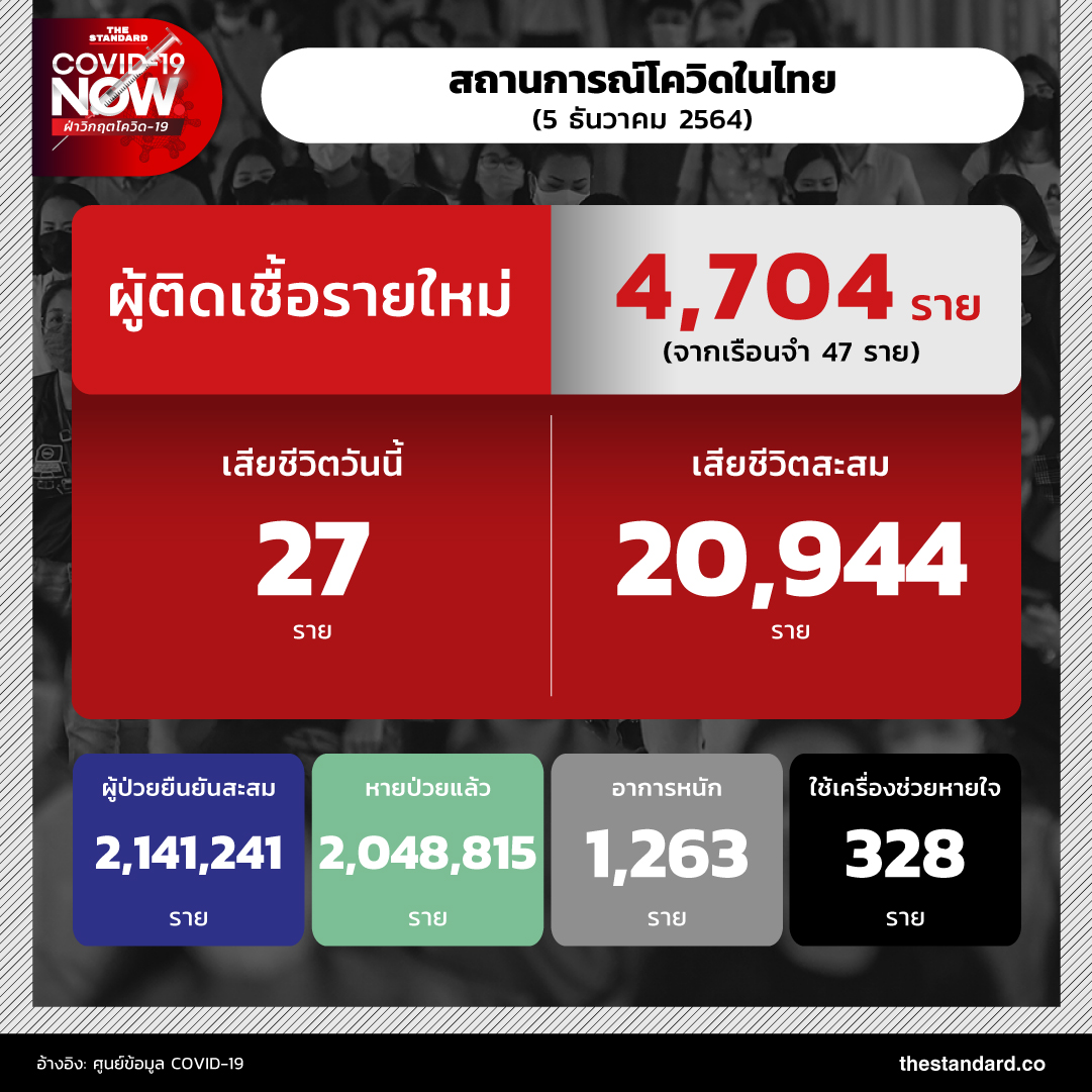 วันนี้ (5 ธันวาคม) สถานการณ์โควิดในประเทศไทย พบผู้ป่วยรายใหม่เพิ่ม 4,704 ราย แบ่งเป็น