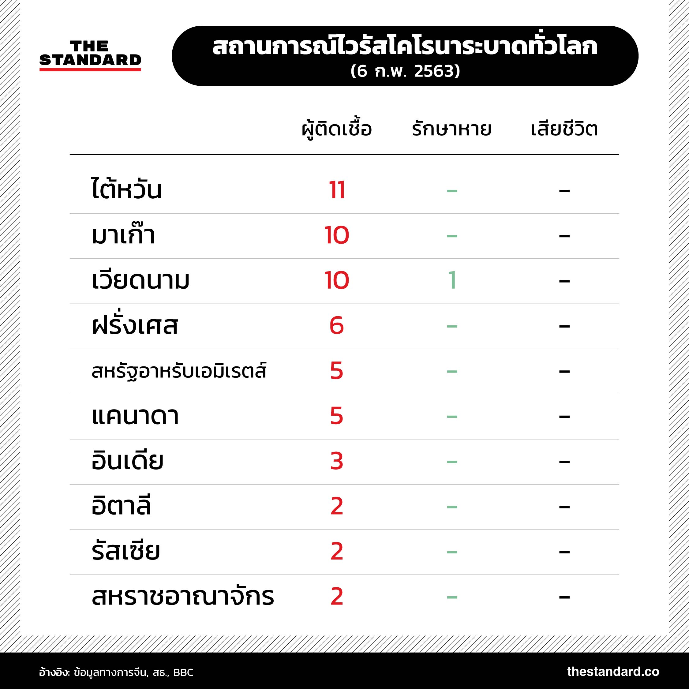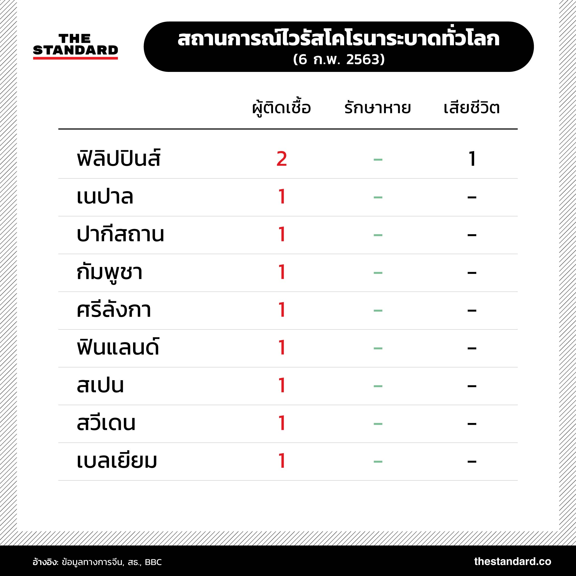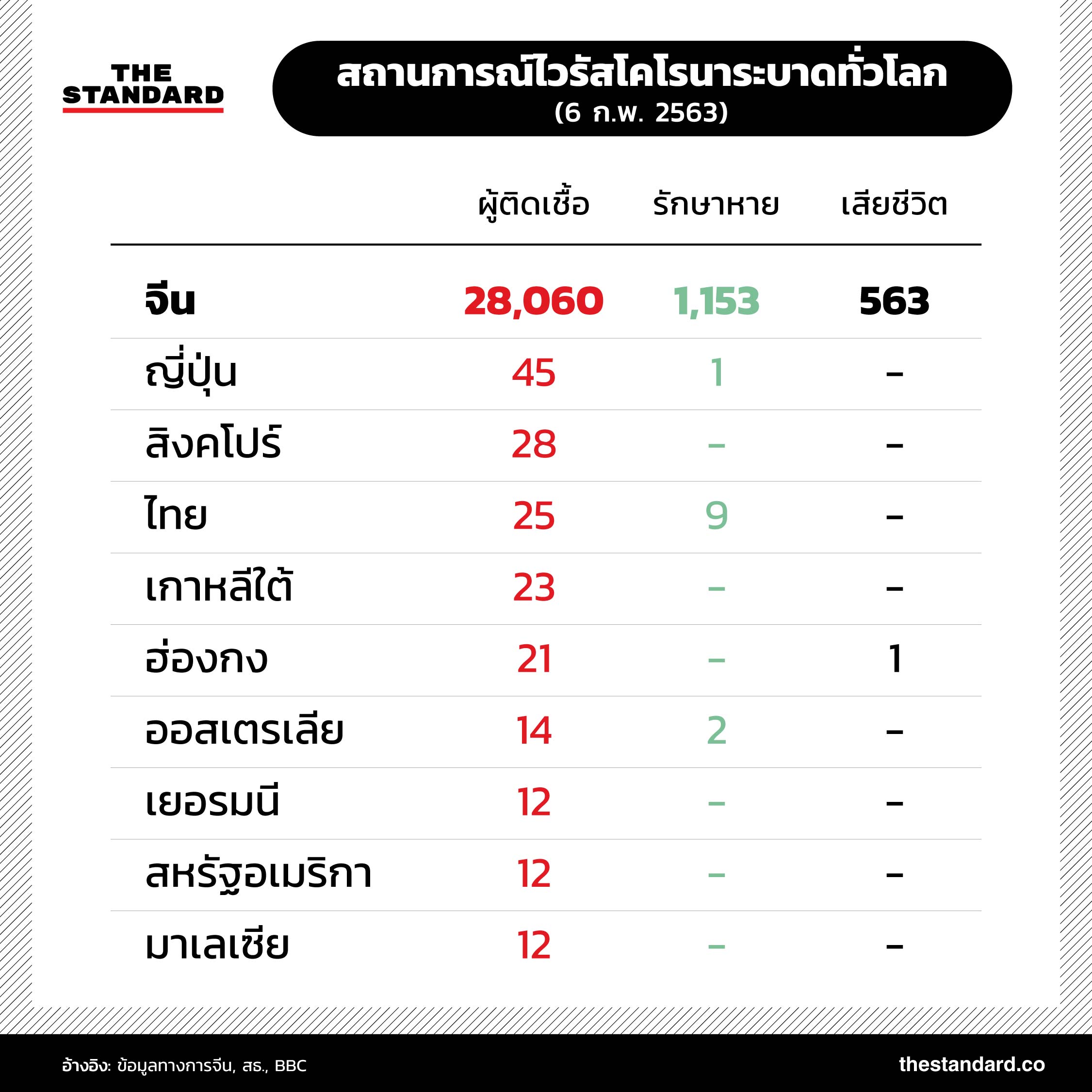 ยอดผู้เสียชีวิตจากไวรัสโคโรนาสายพันธุ์ใหม่ 2019-nCoV ในจีนพุ่งสูงขึ้นเป็น 563 รายแล้ว และมีแนวโน้มเพิ่มสูงขึ้นเรื่อยๆ เช่นเดียวกับจำนวนผู้ติดเชื้อทั้งในประเทศจีนและในต่างประเทศที่เพิ่มมากขึ้นอย่างต่อเนื่อง สถานการณ์การระบาดล่าสุดเป็นอย่างไร THE STANDARD ได้รวบรวมข้อมูลตัวเลขมาไว้ที่นี่แล้ว