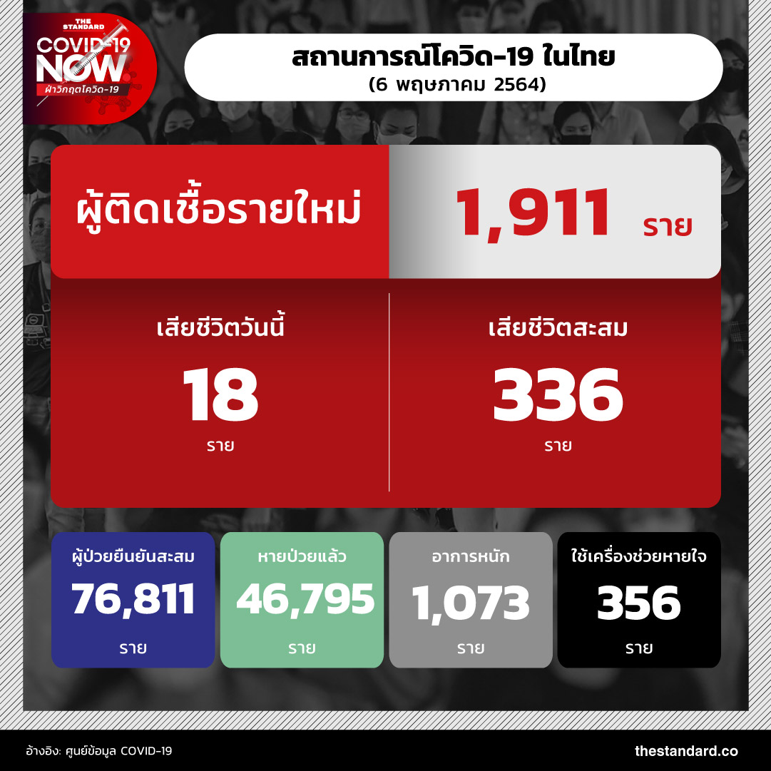 วันนี้ (6 พฤษภาคม) สถานการณ์โควิด-19 ในประเทศไทย พบผู้ป่วยรายใหม่เพิ่ม 1,911 ราย แบ่งเป็นติดเชื้อจากต่างประเทศ 9 ราย ติดเชื้อภายในประเทศ 1,902 ราย