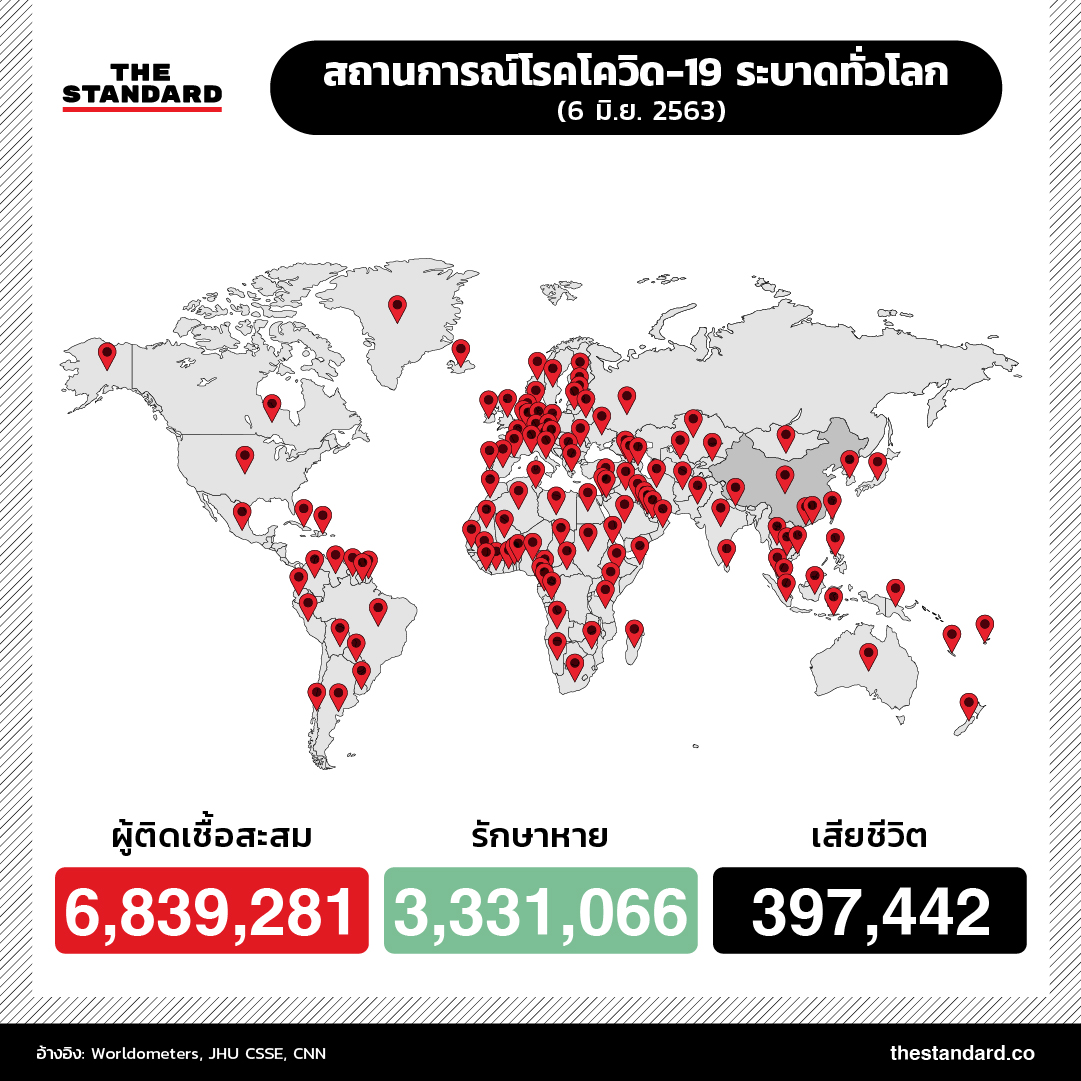 วันนี้ (6 มิถุนายน) การแพร่ระบาดของโควิด-19 ผ่านมานานแล้วกว่า 5 เดือน ยอดผู้ป่วยโควิด-19 ทั่วโลกยังเพิ่มสูงขึ้นอย่างต่อเนื่องแตะ 6.8 ล้านรายแล้ว รักษาหายกว่า 3.1 ล้านราย หรือคิดเป็น 48.7% ของผู้ติดเชื้อทั้งหมด เสียชีวิตแล้ว 397,442 ราย อัตราการเสียชีวิตอยู่ที่ 5.8% โดยทั่วโลกติดเชื้อเพิ่มเกินวันละ 1 แสนราย ติดต่อกันนาน 10 วันแล้ว ตั้งแต่วันที่ 27 พฤษภาคมที่ผ่านมา