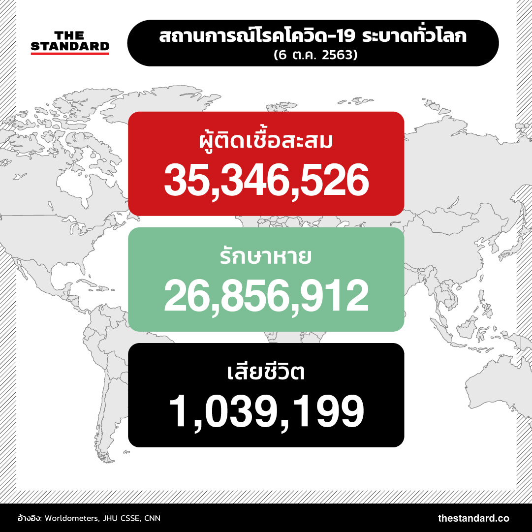 ล่าสุดการแพร่ระบาดผ่านมานานกว่า 9 เดือน ทั่วโลกมีผู้ติดเชื้อสะสม 35.3 ล้านรายแล้ว (35,346,526 ราย) รักษาหายกว่า 26.8 ล้านราย (26,856,912 ราย) หรือคิดเป็นราว 75% ของผู้ติดเชื้อทั้งหมด เสียชีวิตแล้ว 1,039,199 ราย อัตราการเสียชีวิตอยู่ที่ราว 2.95%