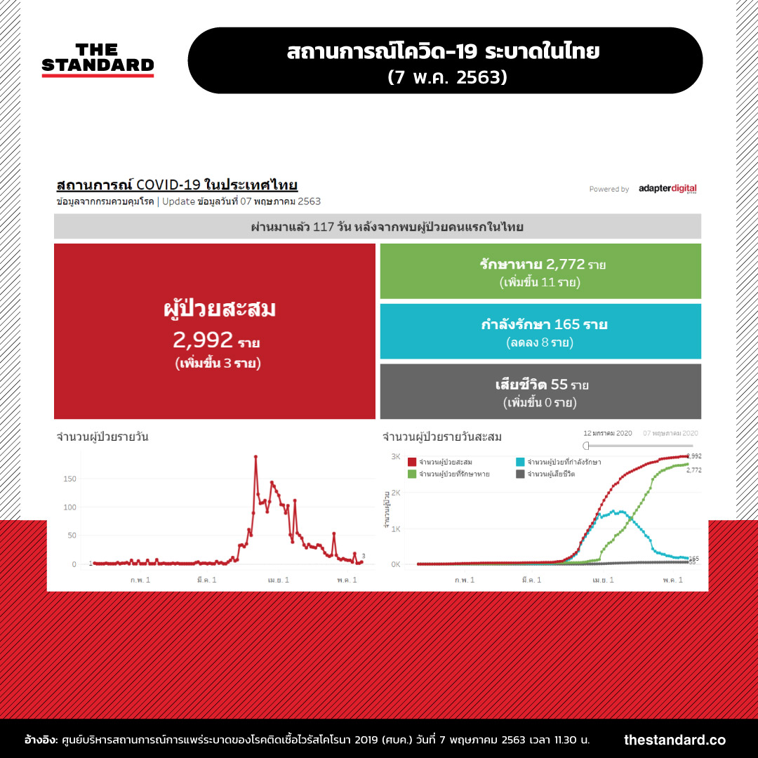 วันนี้ (7 พฤษภาคม) นพ.ทวีศิลป์ วิษณุโยธิน โฆษกศูนย์บริหารสถานการณ์การแพร่ระบาดของโรคติดเชื้อไวรัสโคโรนา 2019 (ศบค.) รายงานสถานการณ์การแพร่ระบาดของโรคโควิด-19 แถลงว่า ไทยพบผู้ป่วยยืนยันเพิ่มเพียง 3 ราย และไม่พบผู้ป่วยเสียชีวิตเพิ่มเติม โดยสรุปวันนี้มีผู้ป่วยกลับบ้านแล้ว 2,772 ราย ยังรักษาตัวในโรงพยาบาล 165 ราย เสียชีวิตรวม 55 ราย รวมมีผู้ป่วยสะสม 2,992 ราย