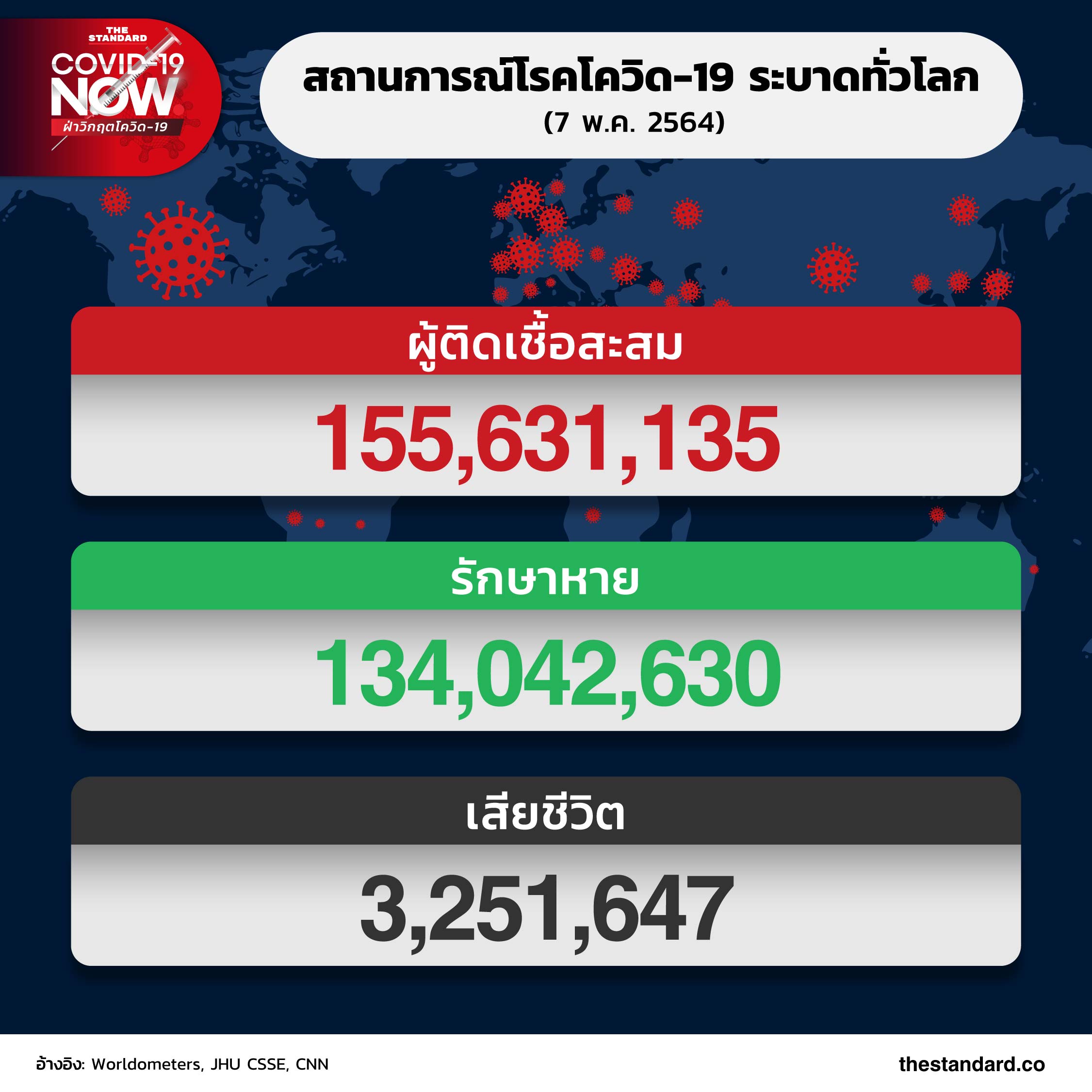 วันนี้ (7 พฤษภาคม) ยอดผู้ติดโควิด-19 สะสมพุ่งสูงกว่า 155 ล้านรายทั่วโลก หลังการแพร่ระบาดผ่านมานานกว่า 1 ปี 4 เดือน ยอดผู้เสียชีวิตสูงกว่า 3.2 ล้านราย อัตราเสียชีวิตอยู่ที่ราว 2.1% รักษาหายแล้วราว 86% ของผู้ติดเชื้อทั้งหมด ขณะนี้มีประเทศที่พบผู้ติดเชื้อแล้ว 186 จาก 193 ประเทศทั่วโลก
