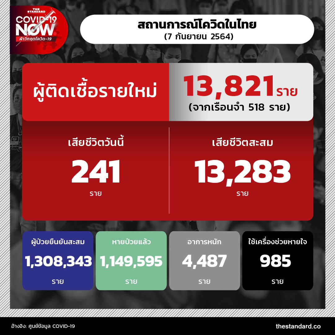 วันนี้ (7 กันยายน) สถานการณ์โควิดในประเทศไทย พบผู้ป่วยรายใหม่เพิ่ม 13,821 ราย แบ่งเป็น