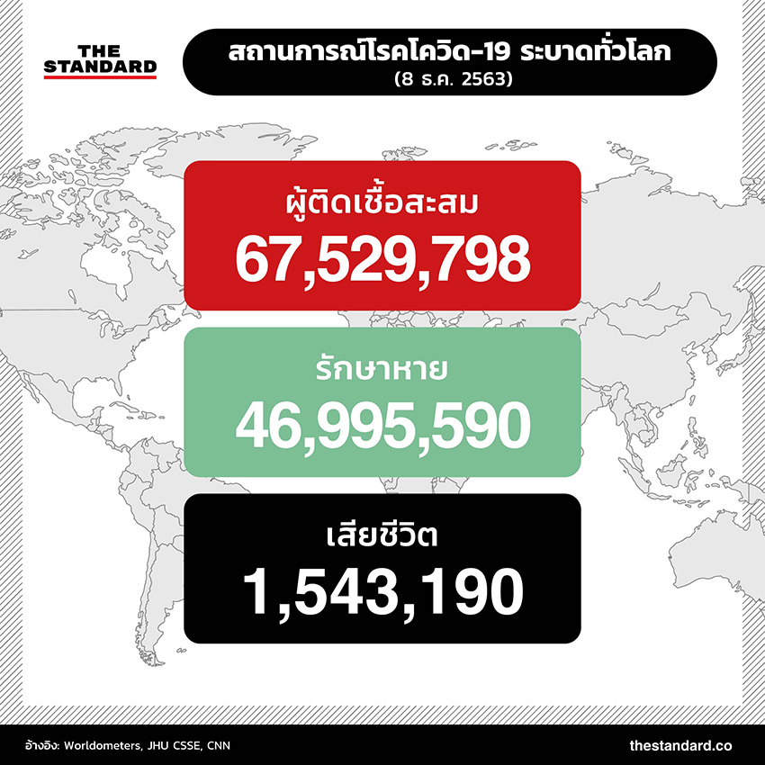 ล่าสุด ทั่วโลกมีผู้ติดเชื้อสะสมแล้วกว่า 67.5 ล้านราย (67,529,798 ราย) รักษาหายกว่า 46.9 ล้านราย (46,995,590 ราย) หรือคิดเป็นราว 69% ของผู้ติดเชื้อทั้งหมด เสียชีวิตแล้ว 1,543,190 ราย อัตราการเสียชีวิตอยู่ที่ราว 2.3%
