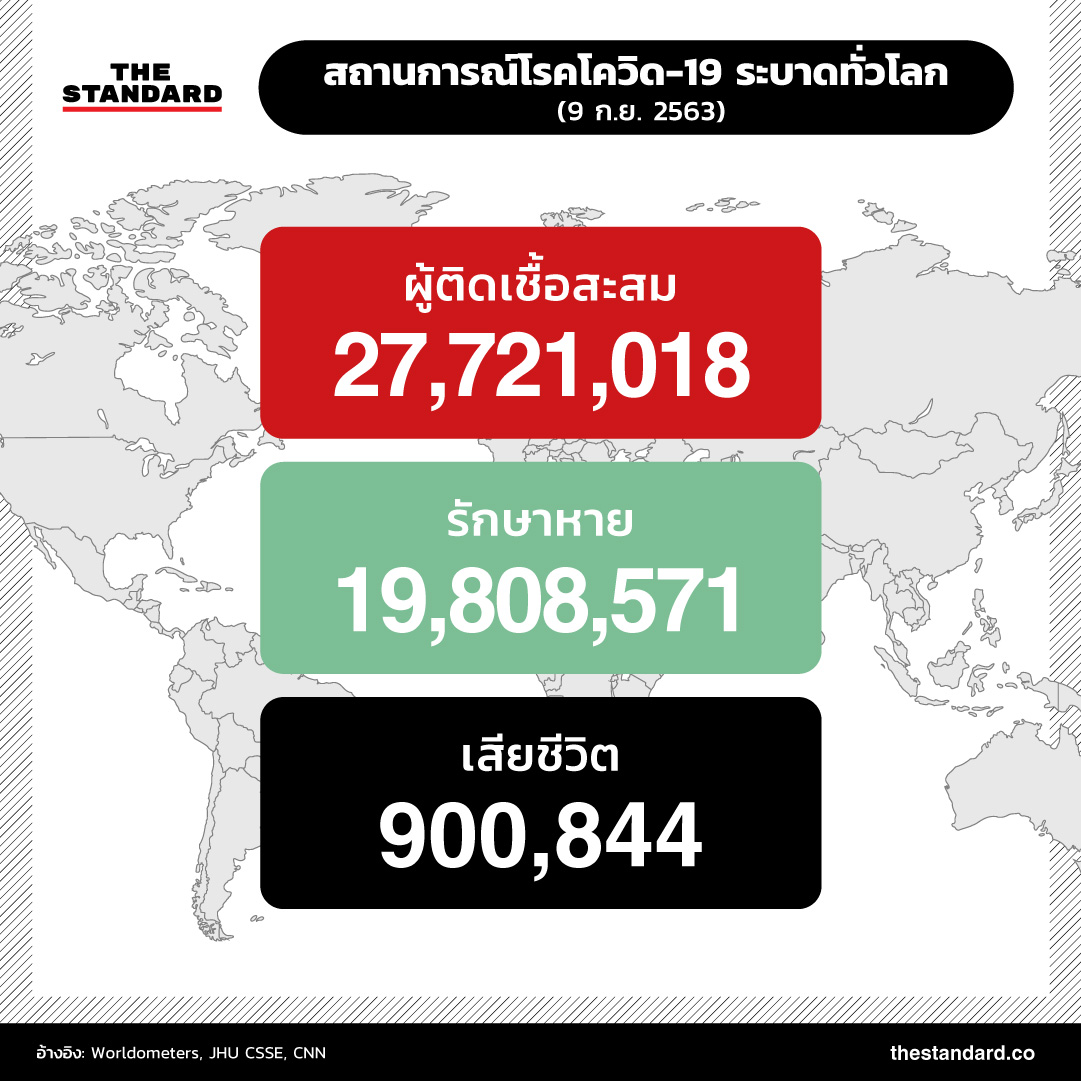 การแพร่ระบาดของโควิด-19 ผ่านมานานกว่า 8 เดือนแล้ว ทั่วโลกมีผู้ติดเชื้อสะสมเกิน 27.7 ล้านรายแล้ว (27,721,018 ราย) รักษาหายกว่า 19.8 ล้านราย (19,808,571 ราย) หรือคิดเป็นเกือบ 2 ใน 3 ของผู้ติดเชื้อทั้งหมด เสียชีวิตแล้ว 900,844 ราย อัตราการเสียชีวิตอยู่ที่ราว 3.3% โดยพบผู้ติดเชื้อเพิ่มเกินวันละ 1 แสนราย ติดต่อกันนานถึง 105 วัน ตั้งแต่วันที่ 27 พฤษภาคมที่ผ่านมา