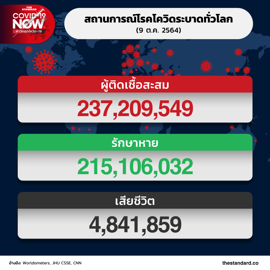 วันนี้ (9 ตุลาคม) ยอดผู้ติดโควิดสะสมพุ่งสูงกว่า 237 ล้านรายทั่วโลก หลังการแพร่ระบาดผ่านมานานกว่า 1 ปี 9 เดือนแล้ว ยอดผู้เสียชีวิตสูงกว่า 4.8 ล้านราย อัตราเสียชีวิตอยู่ที่ราว 2.1% รักษาหายแล้วราว 90% ของผู้ติดเชื้อทั้งหมด ขณะนี้มีประเทศที่พบผู้ติดเชื้อแล้ว 188 จาก 193 ประเทศทั่วโลก โดยประเทศที่ยังไม่พบผู้ติดเชื้อรายแรกอย่างเป็นทางการ ได้แก่ เกาหลีเหนือ เติร์กเมนิสถาน ตองกา ตูวาลู และนาอูรู