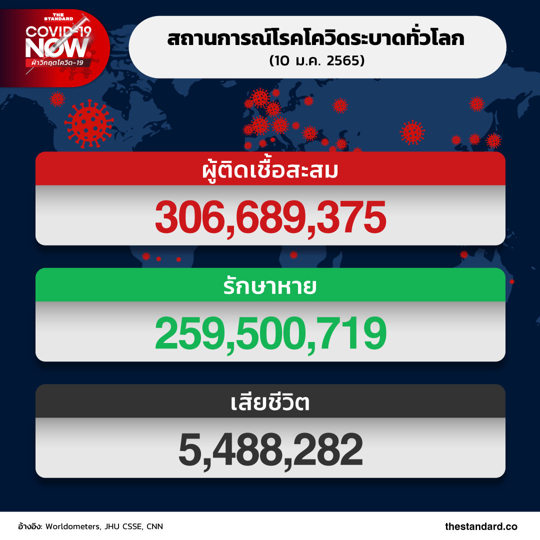 วันนี้ (10 มกราคม) ยอดผู้ติดโควิดสะสมพุ่งสูงกว่า 306 ล้านรายทั่วโลก หลังการแพร่ระบาดผ่านมานานกว่า 2 ปีแล้ว ยอดผู้เสียชีวิตสูงกว่า 5.48 ล้านราย อัตราเสียชีวิตอยู่ที่ราว 2% รักษาหายแล้วราว 90% ของผู้ติดเชื้อทั้งหมด ขณะนี้มีประเทศที่พบผู้ติดเชื้อแล้ว 189 จาก 193 ประเทศทั่วโลก โดยประเทศที่ยังไม่พบผู้ติดเชื้อรายแรกอย่างเป็นทางการ ได้แก่ เกาหลีเหนือ เติร์กเมนิสถาน ตูวาลู และนาอูรู