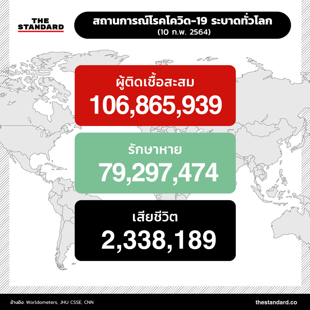 ทั่วโลกมีผู้ติดเชื้อโควิด-19 สะสมแล้วกว่า 106.8 ล้านราย (106,865,939 ราย) รักษาหายแล้ว 79,297,474 ราย หรือคิดเป็นราว 74% ของผู้ติดเชื้อทั้งหมด เสียชีวิตแล้ว 2,338,189 ราย อัตราการเสียชีวิตอยู่ที่ราว 2.2% พบผู้ติดเชื้อแล้วอย่างน้อย 186 จาก 193 ประเทศทั่วโลก