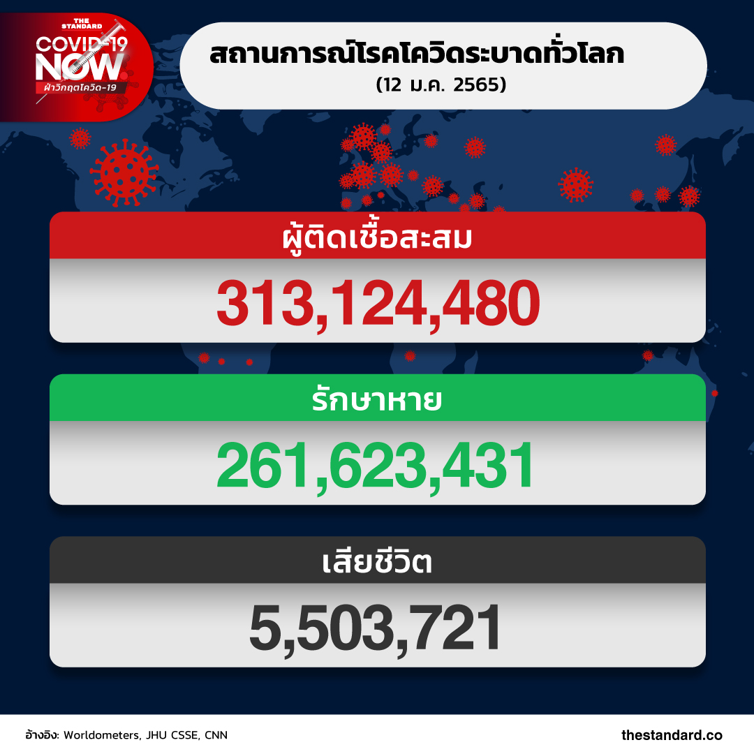 วันนี้ (12 มกราคม) ยอดผู้ติดโควิดสะสมพุ่งสูงกว่า 313 ล้านรายทั่วโลก หลังการแพร่ระบาดผ่านมานานกว่า 2 ปีแล้ว ยอดผู้เสียชีวิตสูงกว่า 5.5 ล้านราย อัตราเสียชีวิตอยู่ที่ราว 2% รักษาหายแล้วราว 90% ของผู้ติดเชื้อทั้งหมด ขณะนี้มีประเทศที่พบผู้ติดเชื้อแล้ว 189 จาก 193 ประเทศทั่วโลก โดยประเทศที่ยังไม่พบผู้ติดเชื้อรายแรกอย่างเป็นทางการ ได้แก่ เกาหลีเหนือ เติร์กเมนิสถาน ตูวาลู และนาอูรู