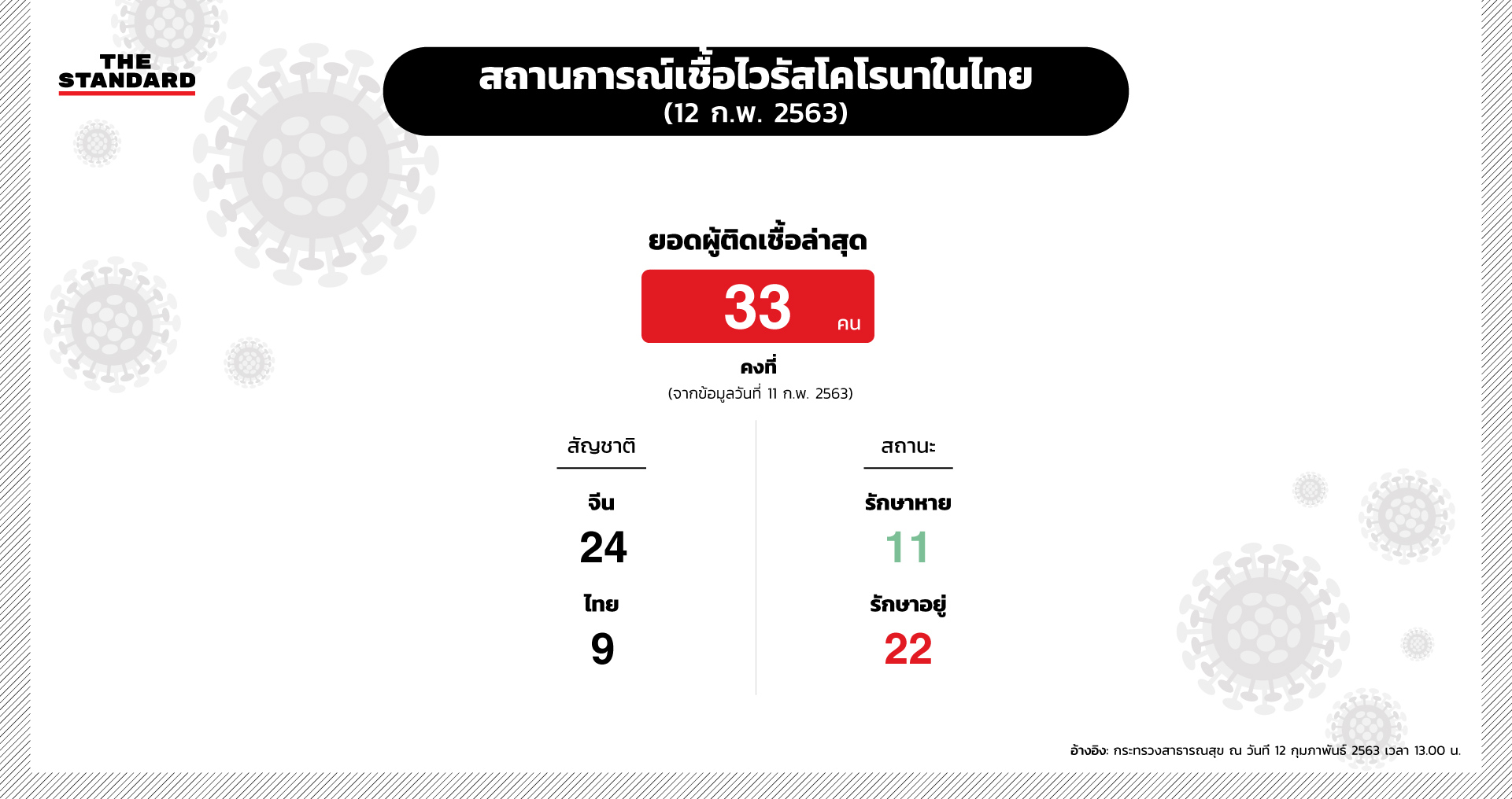 สถานการณ์การเฝ้าระวังผู้ติดเชื้อไวรัสโคโรนาสายพันธุ์ใหม่ยังคงเป็นสิ่งที่หลายหน่วยงานเฝ้าติดตาม รวมถึงออกประกาศมาตรการป้องกันในทุกช่องทางอย่างเข้มงวด THE STANDARD ได้รวบรวมจำนวนตัวเลขของผู้ติดเชื้อที่พบในไทยล่าสุดมาให้ดูกันว่า ตอนนี้สถานการณ์ ณ ปัจจุบันเป็นอย่างไรบ้าง