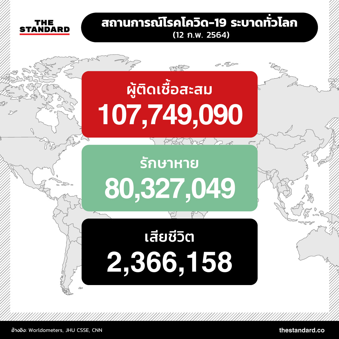 ทั่วโลกมีผู้ติดเชื้อโควิด-19 สะสมแล้วกว่า 107 ล้านราย (107,749,090 ราย) รักษาหายแล้ว 80,327,049 ราย หรือคิดเป็นราว 74% ของผู้ติดเชื้อทั้งหมด เสียชีวิตแล้ว 2,366,158 ราย อัตราการเสียชีวิตอยู่ที่ราว 2.2% พบผู้ติดเชื้อแล้วอย่างน้อย 186 จาก 193 ประเทศทั่วโลก