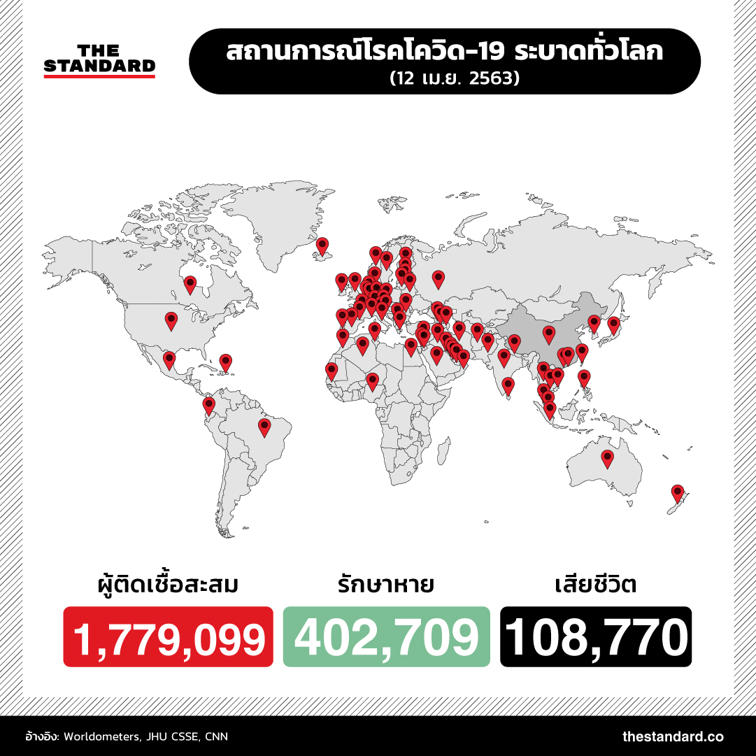 วันนี้ (12 เมษายน) สำนักข่าวต่างประเทศรายงานว่า ยอดผู้ป่วยโควิด-19 สะสมทั่วโลกสูงเกือบ 1.78 ล้านรายแล้ว โดยสหรัฐฯ มีผู้ป่วยโควิด-19 รายใหม่เพิ่มราว 3 หมื่นรายในวันเดียว ส่งผลให้ยอดติดเชื้อสะสมสูงสุดถึง 5.3 แสนราย หรือกว่า 1 ใน 3 ของผู้ป่วยโควิด-19 ทั้งหมด หลังจากตรวจหาการติดเชื้อไปแล้วกว่า 2.67 ล้านรายทั่วประเทศ