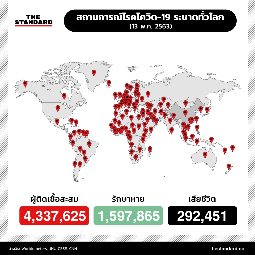 วันนี้ (13 พฤษภาคม) การแพร่ระบาดของโควิด-19 กำลังก้าวเข้าสู่เดือนที่ 5 ยอดผู้ป่วยโควิด-19 ทั่วโลกยังเพิ่มสูงขึ้นอย่างต่อเนื่องสูงกว่า 4.3 ล้านรายแล้ว รักษาหายเกือบ 1.6 ล้านราย หรือกว่า 1 ใน 3 ของผู้ติดเชื้อทั้งหมด เสียชีวิตแล้วเกือบ 3 แสนราย อัตราการเสียชีวิตอยู่ที่ 6.74%