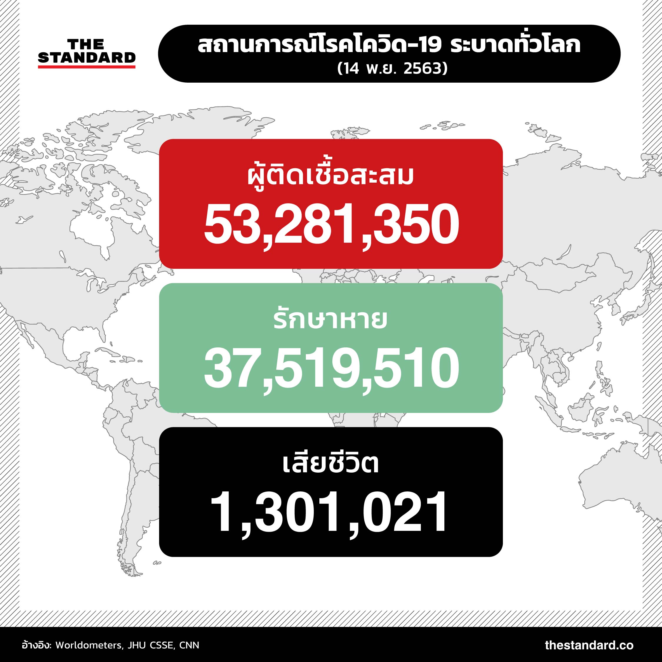 สหรัฐฯ ทำสถิติใหม่ติดเชื้ออย่างน้อย 154,576 รายต่อวัน สูงสุดนับตั้งแต่มีการแพร่ระบาดมา ทั่วโลกมีผู้ติดเชื้อสะสมแล้วกว่า 53.2 ล้านราย (53,281,350 ราย) รักษาหายกว่า 37.5 ล้านราย (37,519,510 ราย) หรือคิดเป็นราว 70% ของผู้ติดเชื้อทั้งหมด เสียชีวิตแล้ว 1,301,021 ราย อัตราการเสียชีวิตอยู่ที่ราว 2.4%