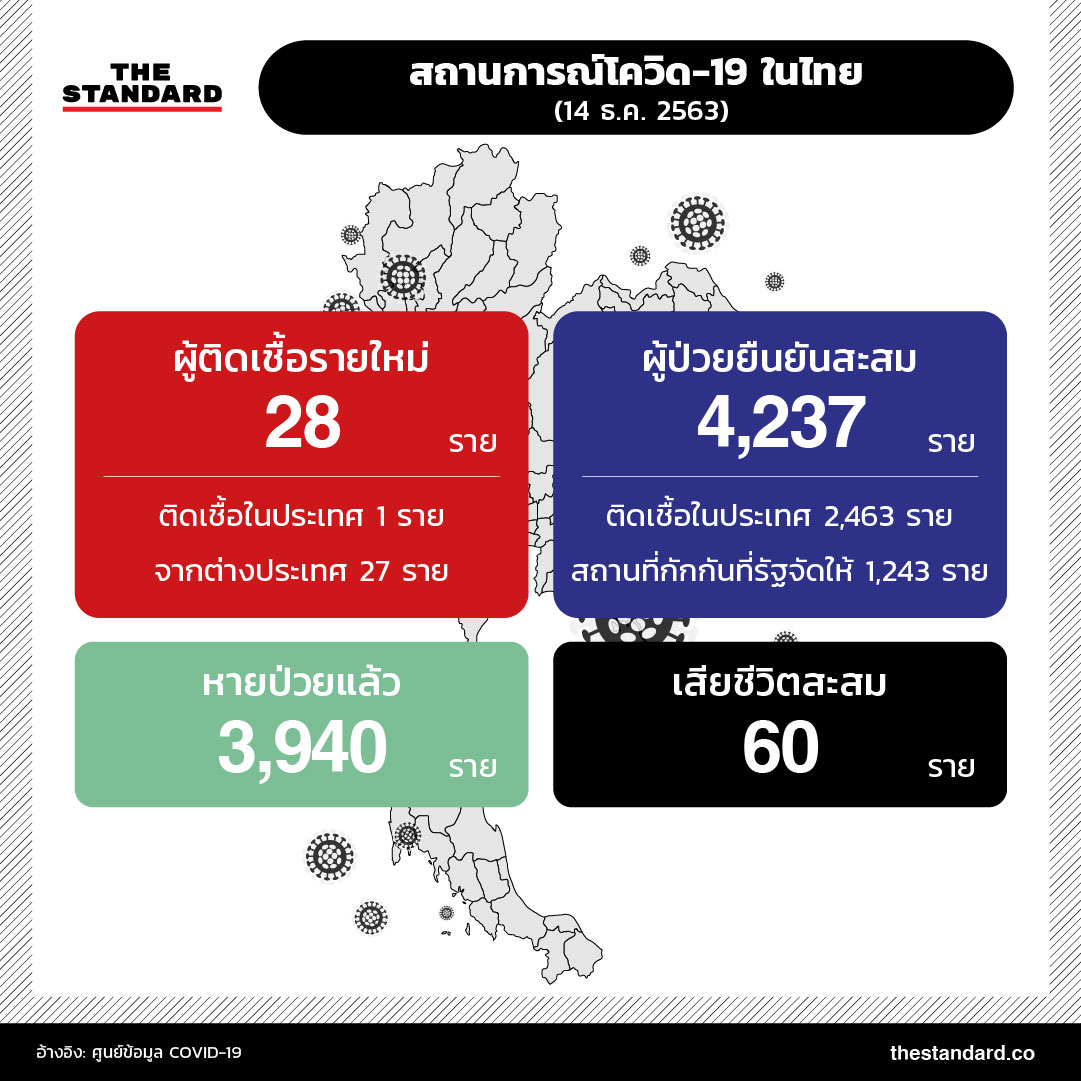วันนี้ (14 ธันวาคม) ศูนย์บริหารสถานการณ์โควิด-19 รายงานสถานการณ์การแพร่ระบาดของโรคติดเชื้อไวรัสโคโรนา 2019 หรือ โควิด-19 ในประเทศไทยประจำวัน