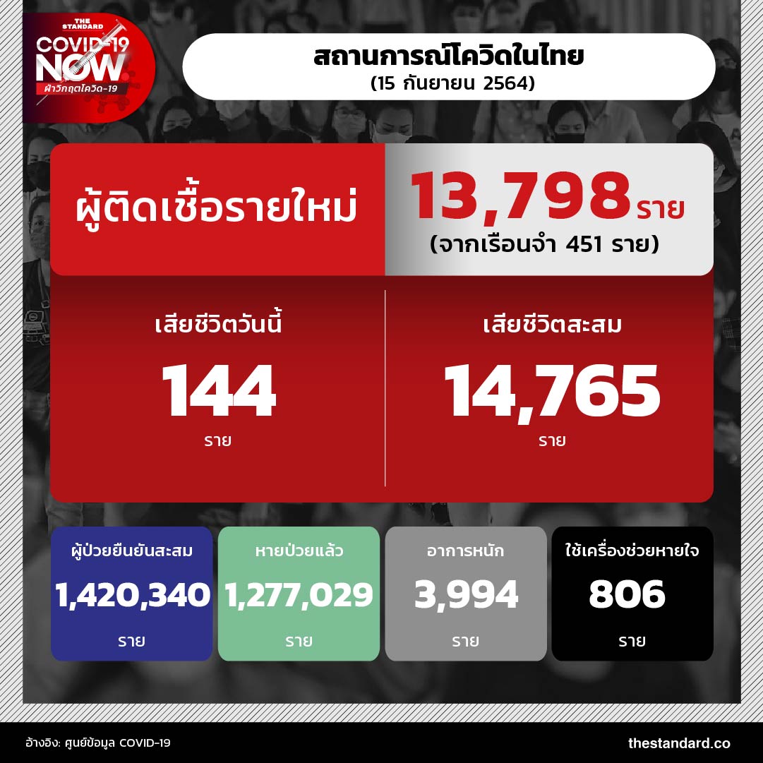 วันนี้ (15 กันยายน) สถานการณ์โควิดในประเทศไทย พบผู้ป่วยรายใหม่เพิ่ม 13,798 ราย แบ่งเป็น