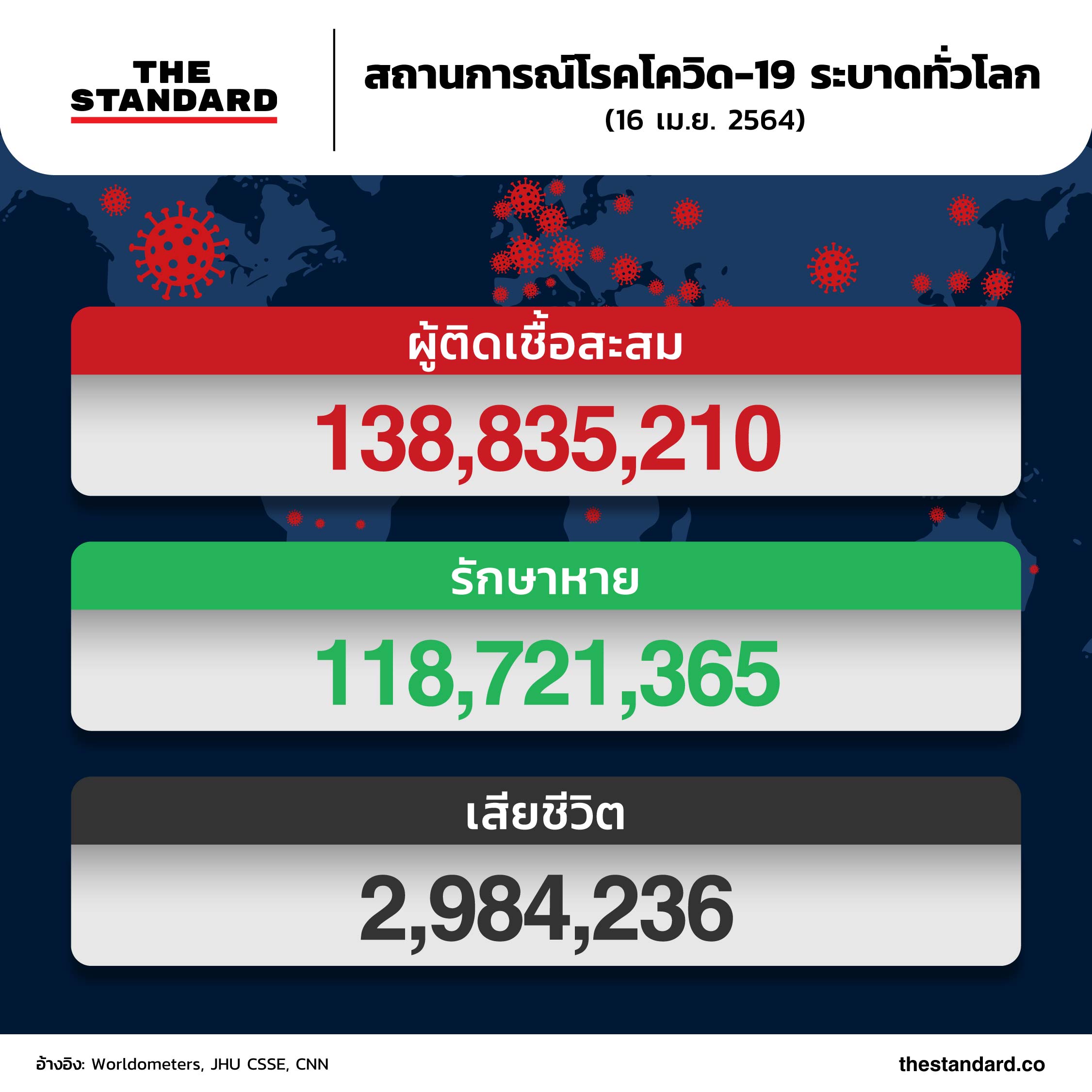 วันนี้ (16 เมษายน) ยอดผู้ติดโควิด-19 สะสมพุ่งสูงเกือบ 139 ล้านรายทั่วโลก หลังการแพร่ระบาดผ่านมานานกว่า 1 ปี 3 เดือน ยอดผู้เสียชีวิตสูงเกือบ 3 ล้านราย อัตราเสียชีวิตอยู่ที่ราว 2.2% รักษาหายแล้วราว 81% ของผู้ติดเชื้อทั้งหมด ขณะนี้มีประเทศที่พบผู้ติดเชื้อแล้ว 186 จาก 193 ประเทศทั่วโลก