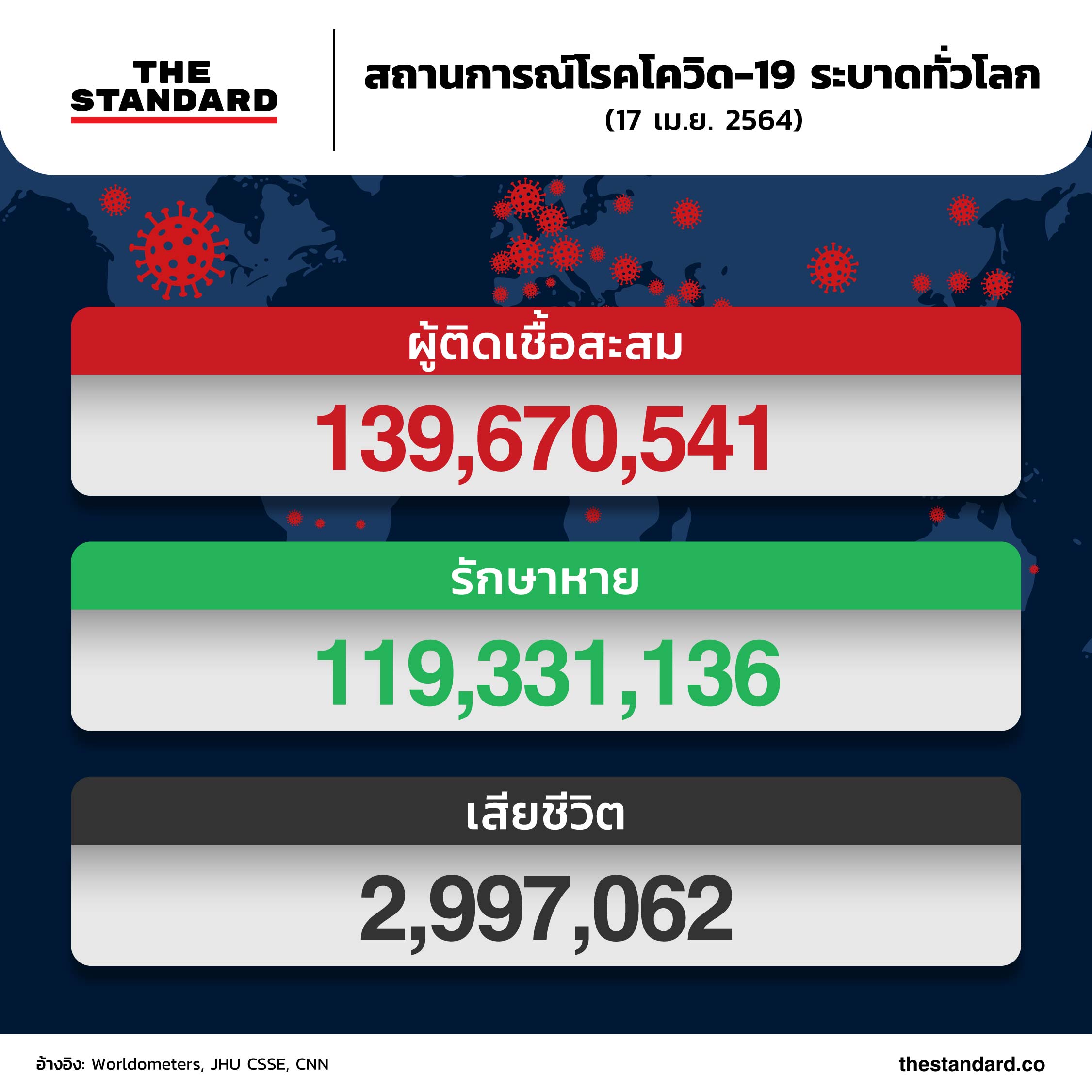 วันนี้ (17 เมษายน) ยอดผู้ติดโควิด-19 สะสมพุ่งสูงเกือบ 140 ล้านรายทั่วโลก หลังการแพร่ระบาดผ่านมานานกว่า 1 ปี 3 เดือน ยอดผู้เสียชีวิตสูงเกือบ 3 ล้านราย อัตราเสียชีวิตอยู่ที่ราว 2.2% รักษาหายแล้วราว 81% ของผู้ติดเชื้อทั้งหมด ขณะนี้มีประเทศที่พบผู้ติดเชื้อแล้ว 186 จาก 193 ประเทศทั่วโลก