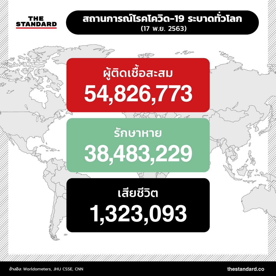 ล่าสุด การแพร่ระบาดของโควิด-19 กำลังก้าวเข้าสู่เดือนที่ 11 ทั่วโลกมีผู้ติดเชื้อสะสมแล้วกว่า 54.8 ล้านราย (54,826,773 ราย) รักษาหายกว่า 38.4 ล้านราย (38,483,229 ราย) หรือคิดเป็นราว 70% ของผู้ติดเชื้อทั้งหมด เสียชีวิตแล้ว 1,323,093 ราย อัตราการเสียชีวิตอยู่ที่ราว 2.4%