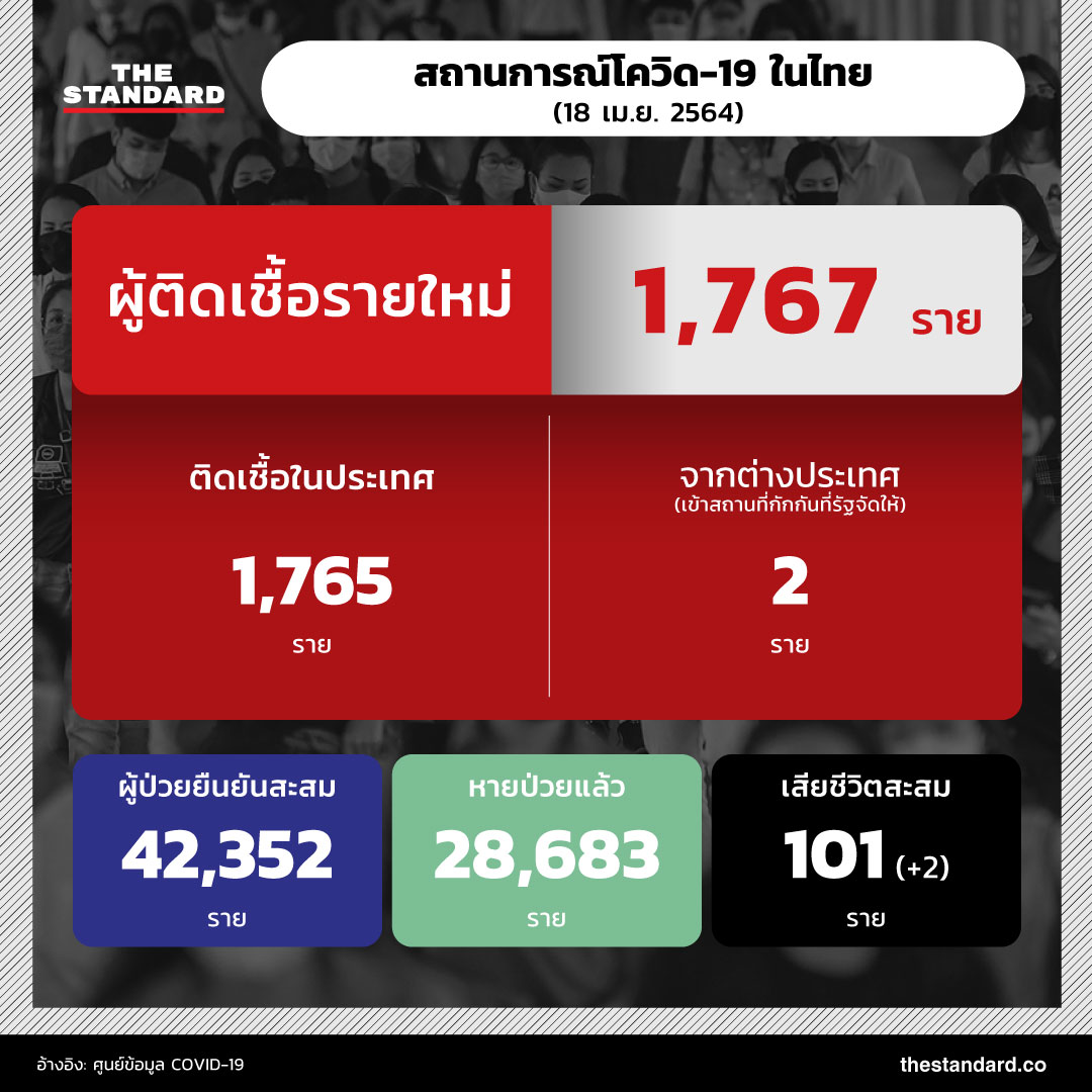 วันนี้ (18 เมษายน) สถานการณ์โควิด-19 ในประเทศไทย พบผู้ป่วยรายใหม่เพิ่ม 1,767 ราย แบ่งเป็นติดเชื้อจากต่างประเทศ 2 ราย และติดเชื้อภายในประเทศ 1,765 ราย