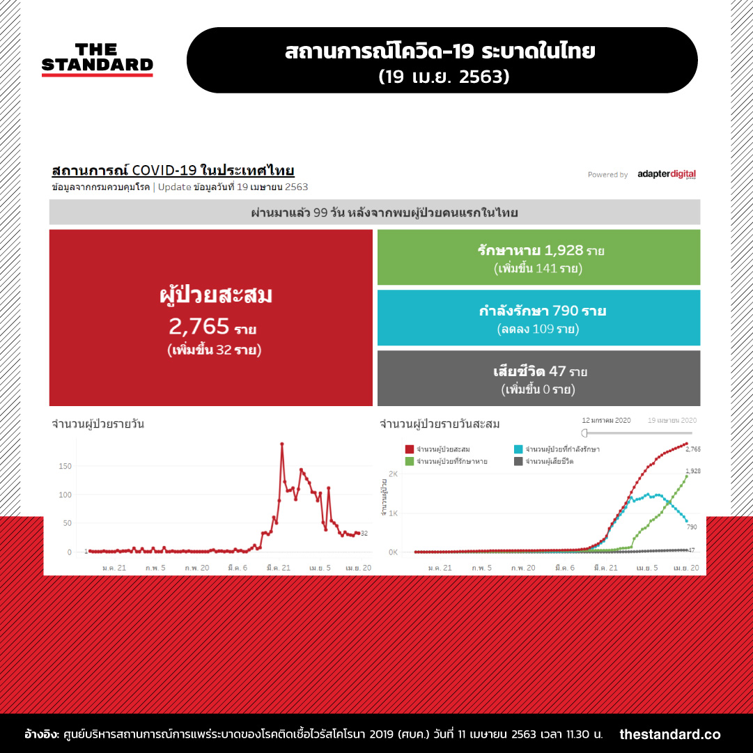วันนี้ (19 เมษายน) นพ.ทวีศิลป์ วิษณุโยธิน โฆษกศูนย์บริหารสถานการณ์การแพร่ระบาดของโรคติดเชื้อไวรัสโคโรนา 2019 (ศบค.) รายงานสถานการณ์การแพร่ระบาดของโรคโควิด-19 แถลงว่า ไทยพบผู้ป่วยยืนยันเพิ่ม 28 ราย และไม่มีรายงานผู้เสียชีวิตเพิ่มเติม โดยสรุปวันนี้ มีผู้ป่วยกลับบ้านแล้ว 1,928 ราย ยังรักษาตัวในโรงพยาบาล 790 ราย เสียชีวิตรวม 47 ราย รวมมีผู้ป่วยสะสม 2,765 ราย
