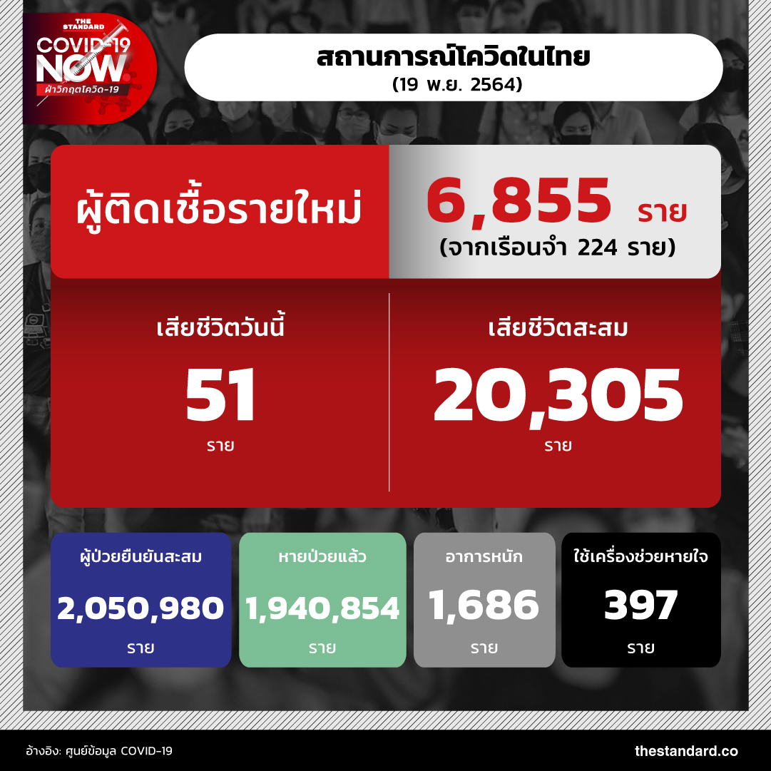 วันนี้ (19 พฤศจิกายน) สถานการณ์โควิดในประเทศไทย พบผู้ป่วยรายใหม่เพิ่ม 6,855 ราย แบ่งเป็น