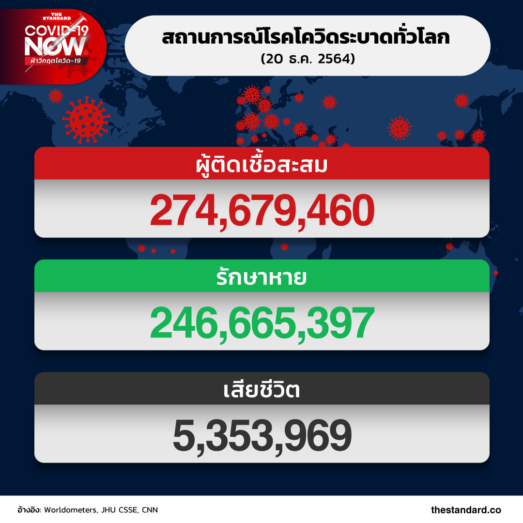 วันนี้ (20 ธันวาคม) ยอดผู้ติดโควิดสะสมพุ่งสูงกว่า 274 ล้านรายทั่วโลก หลังการแพร่ระบาดผ่านมานานเกือบ 2 ปีแล้ว ยอดผู้เสียชีวิตสูงกว่า 5.3 ล้านราย อัตราเสียชีวิตอยู่ที่ราว 2% รักษาหายแล้วราว 90% ของผู้ติดเชื้อทั้งหมด ขณะนี้มีประเทศที่พบผู้ติดเชื้อแล้ว 189 จาก 193 ประเทศทั่วโลก โดยประเทศที่ยังไม่พบผู้ติดเชื้อรายแรกอย่างเป็นทางการ ได้แก่ เกาหลีเหนือ เติร์กเมนิสถาน ตูวาลู และนาอูรู