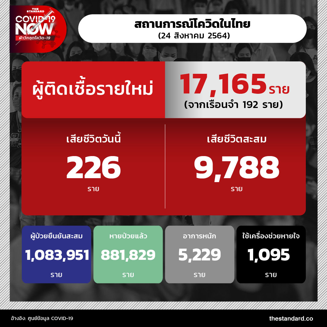 วันนี้ (24 สิงหาคม) สถานการณ์โควิดในประเทศไทย พบผู้ป่วยรายใหม่เพิ่ม 17,165 ราย แบ่งเป็น