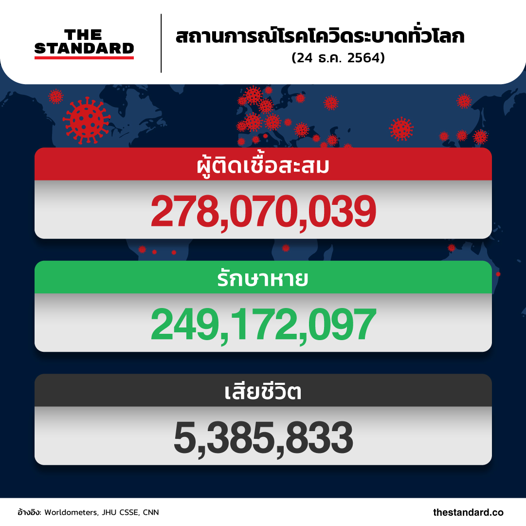 วันนี้ (24 ธันวาคม) ยอดผู้ติดโควิดสะสมพุ่งสูงกว่า 278 ล้านรายทั่วโลก หลังการแพร่ระบาดผ่านมานานเกือบ 2 ปีแล้ว ยอดผู้เสียชีวิตสูงกว่า 5.3 ล้านราย อัตราเสียชีวิตอยู่ที่ราว 2% รักษาหายแล้วราว 90% ของผู้ติดเชื้อทั้งหมด ขณะนี้มีประเทศที่พบผู้ติดเชื้อแล้ว 189 จาก 193 ประเทศทั่วโลก โดยประเทศที่ยังไม่พบผู้ติดเชื้อรายแรกอย่างเป็นทางการ ได้แก่ เกาหลีเหนือ เติร์กเมนิสถาน ตูวาลู และนาอูรู