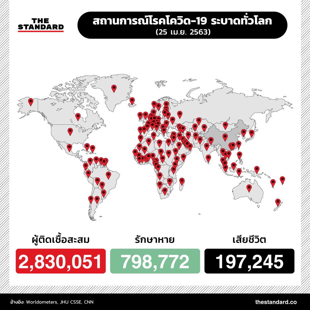 วันนี้ (25 เมษายน) การแพร่ระบาดของโควิด-19 กำลังก้าวเข้าสู่เดือนที่ 4 ยอดผู้ป่วยโควิด-19 ทั่วโลกเพิ่มสูงถึง 2.8 ล้านรายแล้ว รักษาหายแล้วเกือบ 8 แสนราย หรือกว่า 1 ใน 4 ของผู้ติดเชื้อทั้งหมด เสียชีวิตแล้วเกือบ 2 แสนราย อัตราการเสียชีวิตอยู่ที่ราว 7%