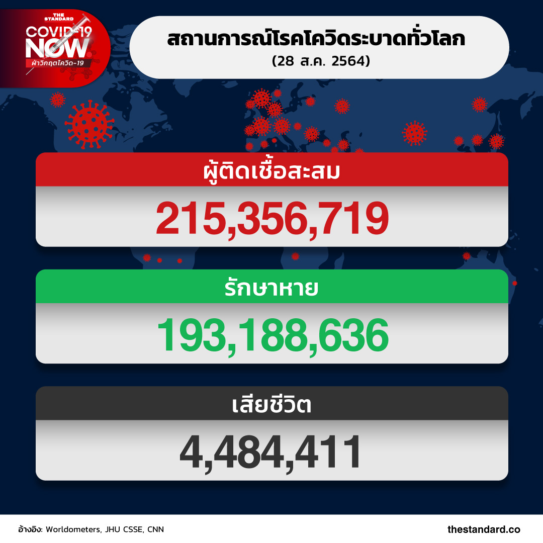 วันนี้ (28 สิงหาคม) ยอดผู้ติดโควิดสะสมพุ่งสูงกว่า 215 ล้านรายทั่วโลก หลังการแพร่ระบาดผ่านมานานเกือบ 1 ปี 8 เดือนแล้ว ยอดผู้เสียชีวิตสูงกว่า 4.4 ล้านราย อัตราเสียชีวิตอยู่ที่ราว 2.1% รักษาหายแล้วราว 90% ของผู้ติดเชื้อทั้งหมด ขณะนี้มีประเทศที่พบผู้ติดเชื้อแล้ว 188 จาก 193 ประเทศทั่วโลก