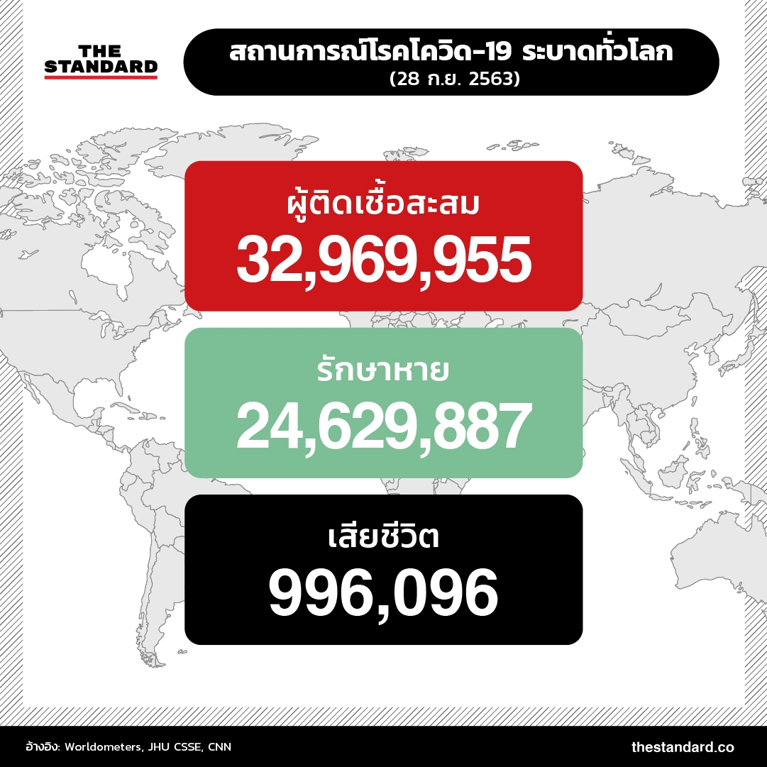 ล่าสุดการแพร่ระบาดของโควิด-19 กำลังจะก้าวเข้าสู่เดือนที่ 9 ทั่วโลกมีผู้ติดเชื้อสะสมเกือบ 33 ล้านรายแล้ว (32,969,955 ราย) รักษาหายกว่า 24.6 ล้านราย (24,629,887 ราย) หรือคิดเป็นกว่า 2 ใน 3 ของผู้ติดเชื้อทั้งหมด เสียชีวิตแล้ว 996,096 ราย อัตราการเสียชีวิตอยู่ที่ราว 3%