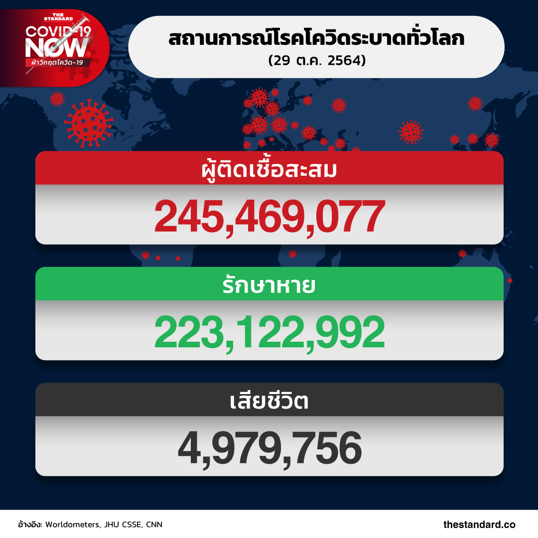 วันนี้ (29 ตุลาคม) ยอดผู้ติดโควิดสะสมพุ่งสูงกว่า 245 ล้านรายทั่วโลก หลังการแพร่ระบาดผ่านมานานเกือบ 1 ปี 10 เดือนแล้ว ยอดผู้เสียชีวิตสูงกว่า 4.9 ล้านราย อัตราเสียชีวิตอยู่ที่ราว 2% รักษาหายแล้วราว 91% ของผู้ติดเชื้อทั้งหมด ขณะนี้มีประเทศที่พบผู้ติดเชื้อแล้ว 188 จาก 193 ประเทศทั่วโลก โดยประเทศที่ยังไม่พบผู้ติดเชื้อรายแรกอย่างเป็นทางการได้แก่ เกาหลีเหนือ, เติร์กเมนิสถาน, ตองกา, ตูวาลู และนาอูรู