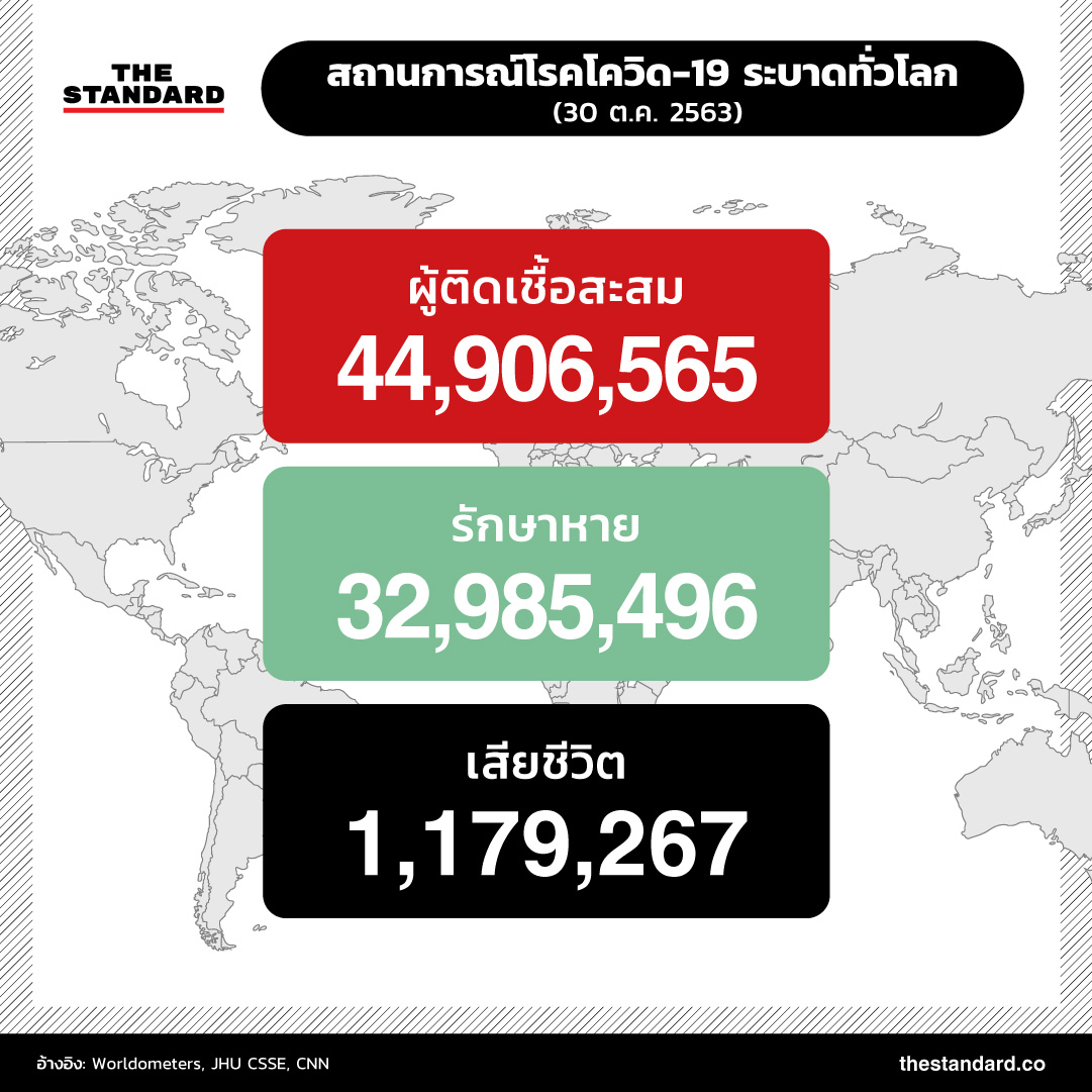 ทั่วโลกมีผู้ติดเชื้อสะสมแล้ว 44.9 ล้านราย (44,906,565 ราย) รักษาหายกว่า 32.9 ล้านราย (32,985,496 ราย) หรือคิดเป็นราว 75% ของผู้ติดเชื้อทั้งหมด เสียชีวิตแล้ว 1,179,267 ราย อัตราการเสียชีวิตอยู่ที่ราว 2.7%