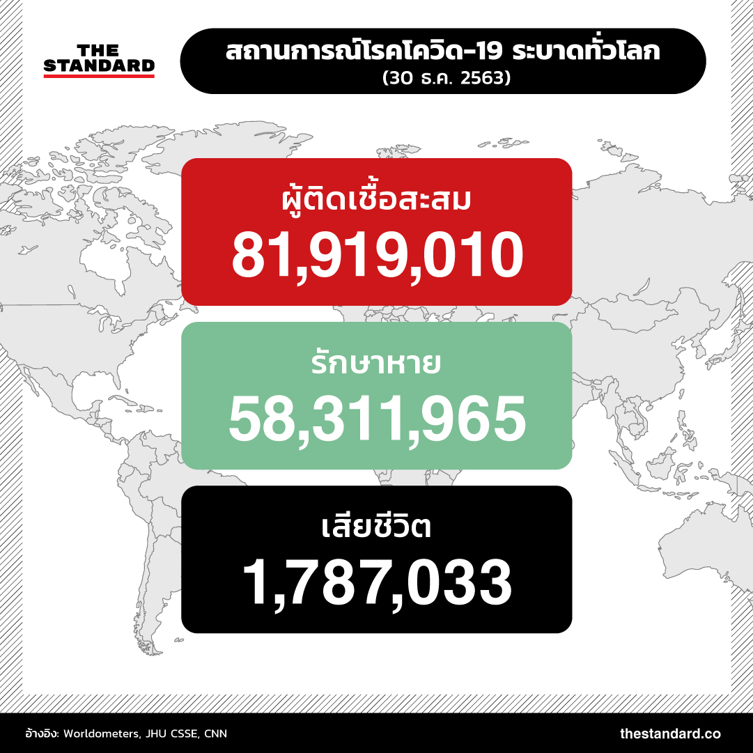 ยอดสะสมทั่วโลกอยู่ที่ 81.9 ล้านราย (81,919,010 ราย) รักษาหายกว่า 58.3 ล้านราย (58,311,965 ราย) หรือคิดเป็นราว 71% ของผู้ติดเชื้อทั้งหมด เสียชีวิตแล้ว 1,787,033 ราย อัตราการเสียชีวิตอยู่ที่ราว 2.2%