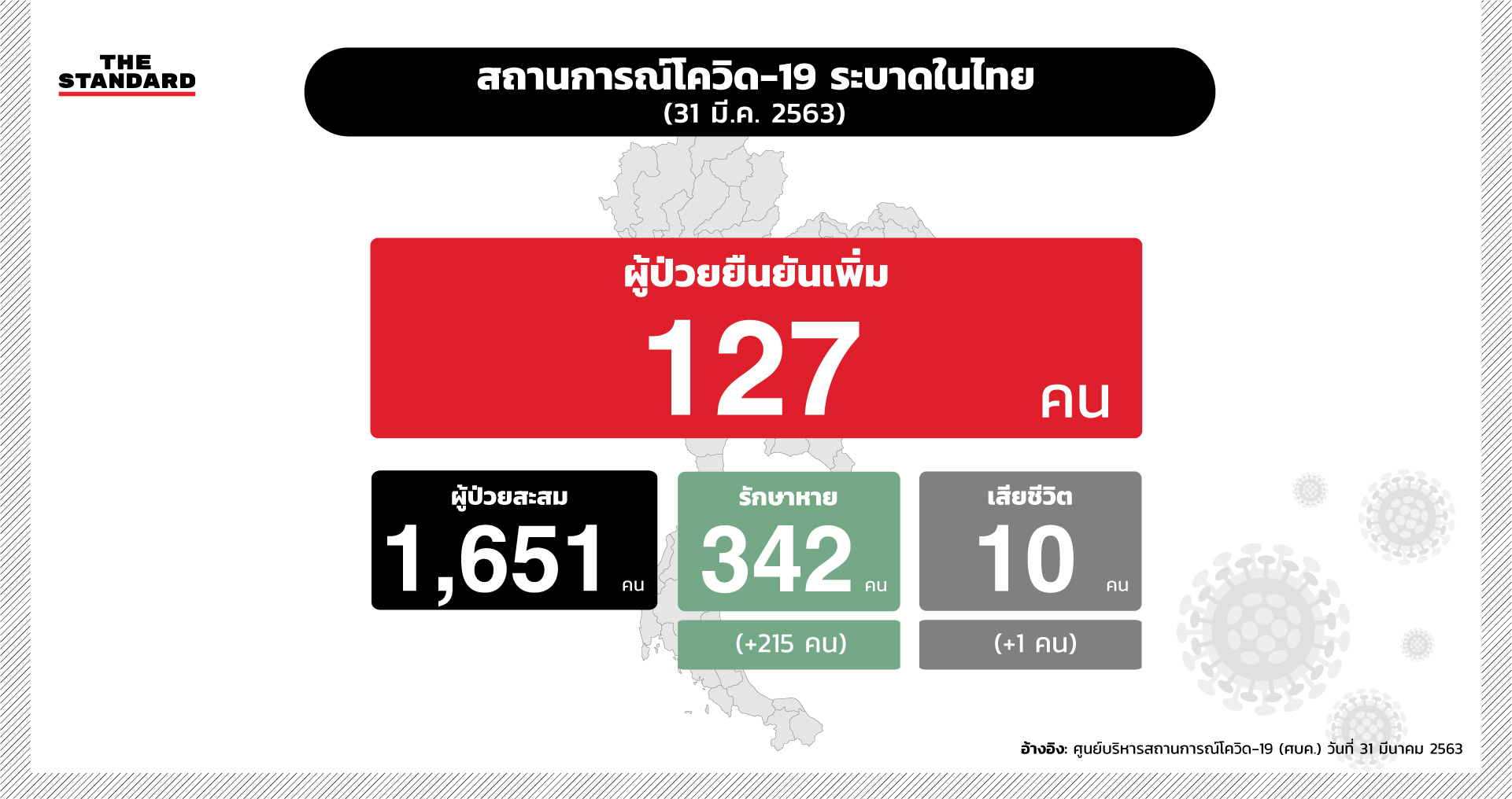 วันนี้ (31 มีนาคม 2563) นพ.ทวีศิลป์ วิษณุโยธิน โฆษกศูนย์อำนวยการแก้ไขสถานการณ์การแพร่ระบาดเชื้อไวรัสโควิด-19 (ศบค.) แถลงว่า ไทยพบผู้ป่วยยืนยันเพิ่มเพิ่ม 127 คน รวมสะสม 1,651 คน เสียชีวิตเพิ่ม 1 คน รวมเสียชีวิต 10 คน