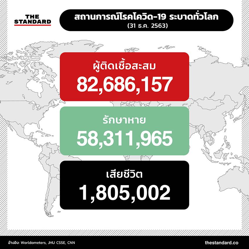 วันนี้ (31 ธันวาคม) การแพร่ระบาดของโรคปอดอักเสบลึกลับในเมืองอู่ฮั่น หรือที่ต่อมาได้รับการตั้งชื่ออย่างเป็นทางการว่าโควิด-19 ผ่านมาแล้ว 1 ปี ทั่วโลกติดโควิด-19 สะสม 82.6 ล้านราย (82,686,157 ราย) รักษาหายกว่า 58.3 ล้านราย (58,311,965 ราย) หรือคิดเป็นราว 71% ของผู้ติดเชื้อทั้งหมด เสียชีวิตแล้ว 1,805,002 ราย อัตราการเสียชีวิตอยู่ที่ราว 2.2%