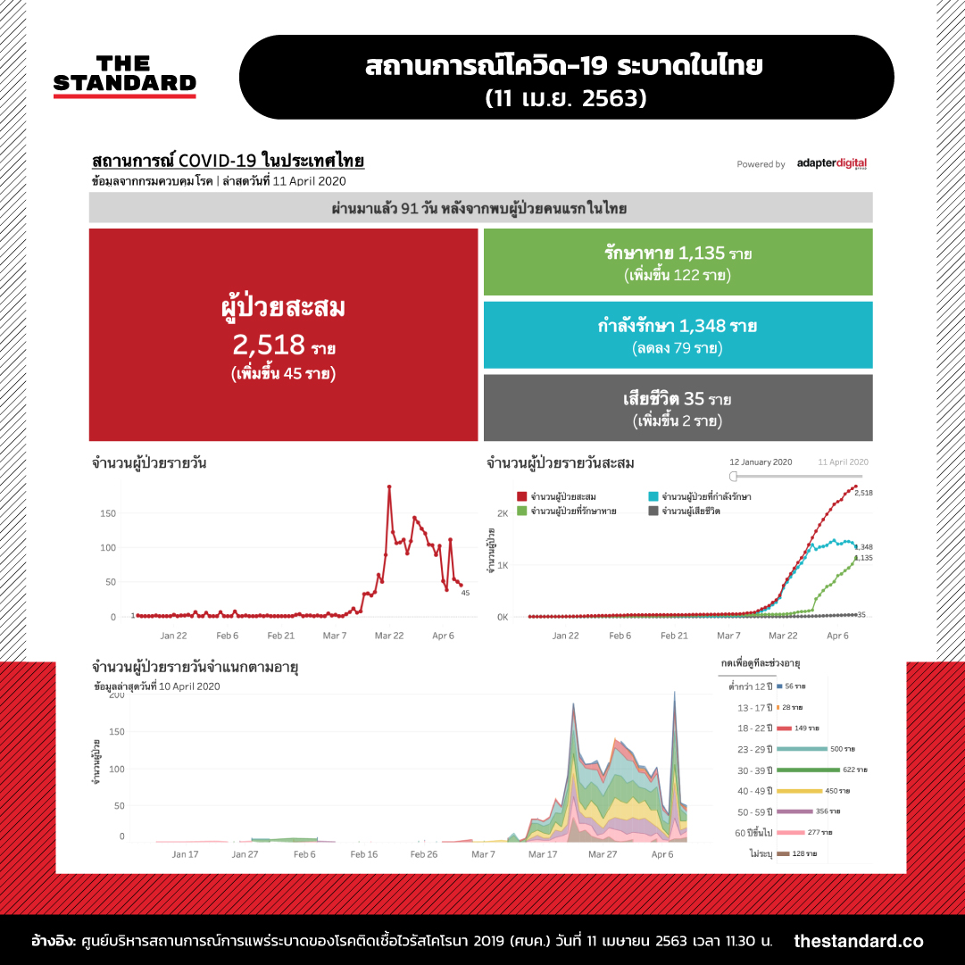 วันนี้ (11 เมษายน) นพ.ทวีศิลป์ วิษณุโยธิน โฆษกศูนย์บริหารสถานการณ์การแพร่ระบาดของโรคติดเชื้อไวรัสโคโรนา 2019 (ศบค.) เปิดเผยสถานการณ์ผู้ป่วยโควิด-19 พบว่ามีผู้ป่วยรายใหม่เพิ่ม 45 ราย รวมยอดสะสมในไทย 2,518 ราย ขณะเดียวกันมีรายงานผู้เสียชีวิตเพิ่ม 2 ราย โดยรายละเอียดของผู้ป่วยรายใหม่แบ่งเป็น 4 กลุ่ม ดังนี้