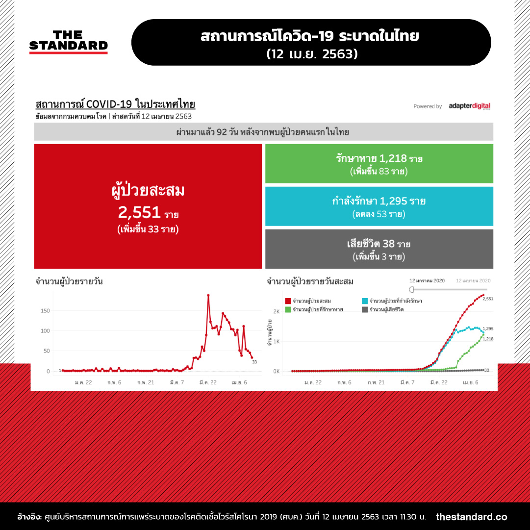 วันนี้ (12 เมษายน) นพ.ทวีศิลป์ วิษณุโยธิน โฆษกศูนย์บริหารสถานการณ์การแพร่ระบาดของโรคติดเชื้อไวรัสโคโรนา 2019 (ศบค.) รายงานสถานการณ์การแพร่ระบาดของโรคโควิด-19 แถลงว่า ไทยพบผู้ป่วยยืนยันเพิ่ม 33 ราย เสียชีวิตเพิ่ม 3 ราย โดยสรุปวันนี้มีผู้ป่วยกลับบ้านแล้ว 1,218 ราย ยังรักษาตัวในโรงพยาบาล 1,295 ราย เสียชีวิตรวม 38 ราย รวมมีผู้ป่วยสะสม 2,551 ราย