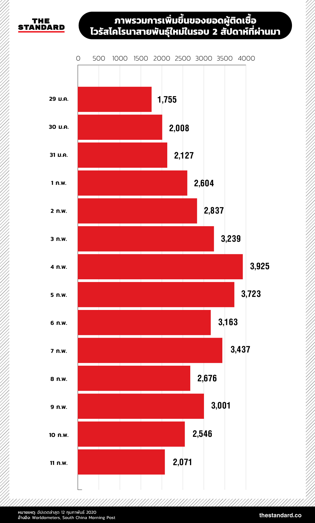 นี่คือภาพรวมการเพิ่มขึ้นของยอดผู้ติดเชื้อไวรัสโคโรนาสายพันธุ์ใหม่ (Covid-19) ในแต่ละวันในช่วง 2 สัปดาห์ที่ผ่านมา โดยมีผู้ติดเชื้อรายใหม่เพิ่มสูงสุดเมื่อวันที่ 4 กุมภาพันธ์ เพิ่มสูงขึ้นถึง 3,925 ราย ก่อนที่จะมีแนวโน้มลดลงในไม่กี่วันต่อมา โดยยอดผู้ติดเชื้อล่าสุดอยู่ที่ 45,171 ราย เสียชีวิต 1,115 ราย รักษาหายแล้ว 4,831 ราย