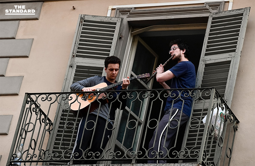 อย่างไรก็ดี แม้จะอยู่ในสถานการณ์ที่ตึงเครียดแค่ไหน แต่พลเมืองอิตาลีบางส่วนที่ต้องกักตัวในอาคารชุด อพาร์ตเมนต์ ก็ออกมาส่งต่อกำลังใจให้กันและกันด้วยการร้องรำทำเพลง เต้นไปกับจังหวะเสียงเพลง หรือติดป้ายข้อความว่า ‘andrà tutto bene’ หรือทุกๆ อย่างจะผ่านพ้นไปด้วยดี บนระเบียงห้องของตัวเอง