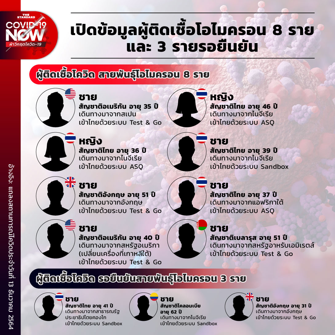 วันนี้ (13 ธันวาคม) ในการแถลงสถานการณ์โควิดประจำวัน นพ.ศุภกิจ ศิริลักษณ์ อธิบดีกรมวิทยาศาสตร์การแพทย์ เปิดเผยว่า จากข้อมูลของเขตสุขภาพทั้ง 13 เขต ที่มีการนำตัวอย่างของผู้ติดเชื้อโควิดที่เดินทางเข้าไทยตั้งแต่วันเปิดประเทศ วันที่ 1 พฤศจิกายน ถึงวันที่ 10 ธันวาคม 2564 มาจำแนกสายพันธุ์ของเชื้อโควิด ล่าสุดพบเชื้อโควิดสายพันธุ์ใหม่โอไมครอน ในไทยแล้ว 8 ราย ขณะที่อีก 3 รายรอผลตรวจยืนยันอีกครั้ง โดยรายละเอียดของทั้ง 11 คน มีดังนี้