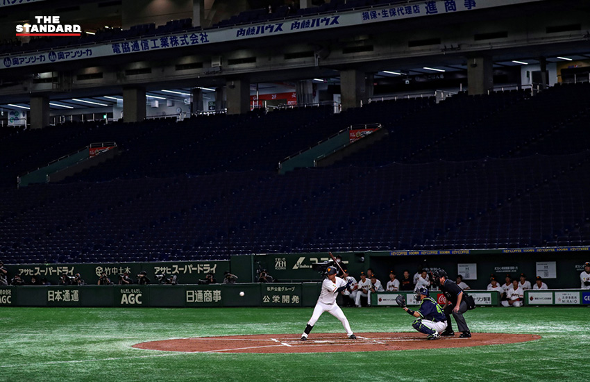 อัฒจันทร์ที่วางเปล่าของโตเกียวโดม ระหว่างการแข่งขันเบสบอลพรีซีซัน ระหว่าง Yomiuri Giants และ Tokyo Yakult Swallows เมื่อวันที่ 29 กุมภาพันธ์ 2020 ที่กรุงโตเกียว ประเทศญี่ปุ่น